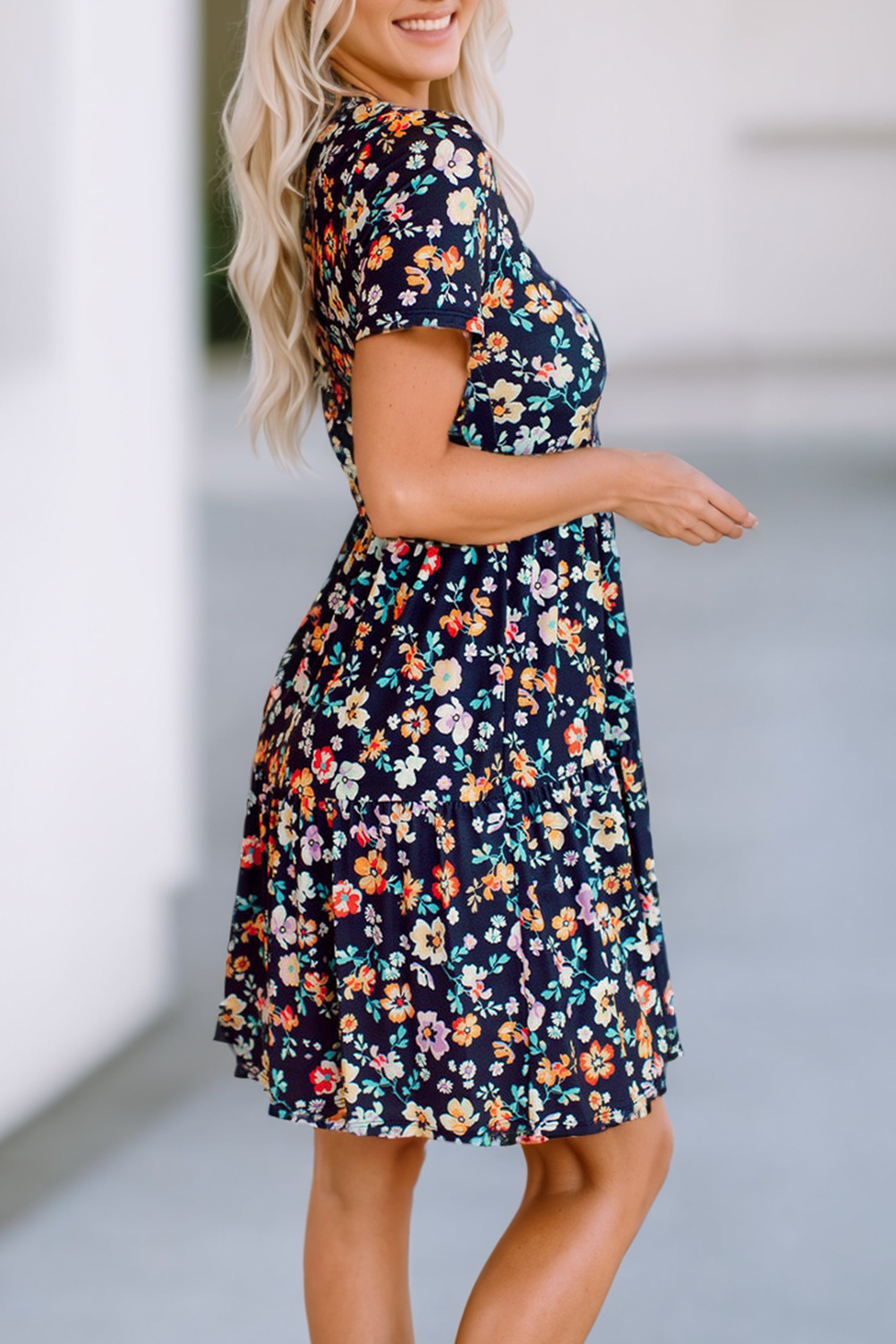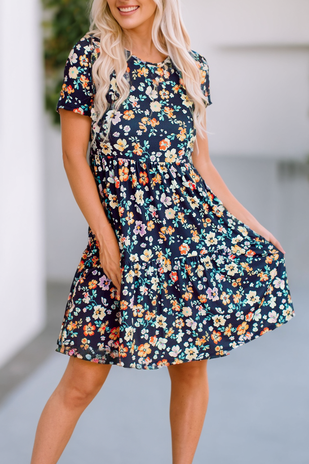 Kelsey ~ Short Sleeve A-line Floral Dress: Blue