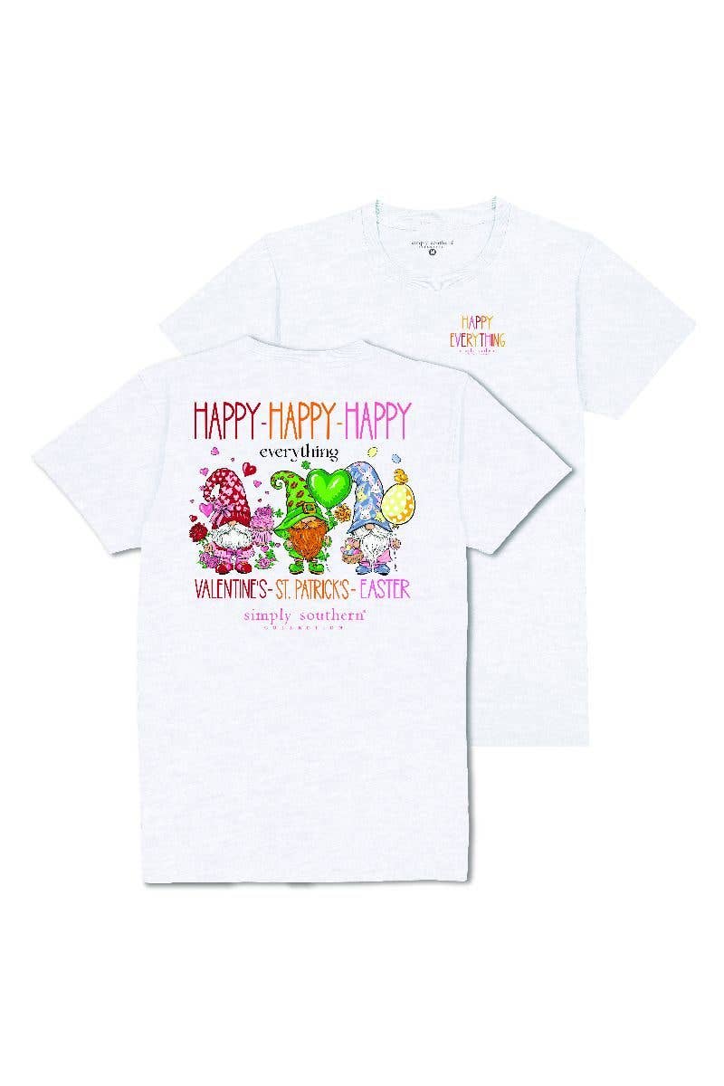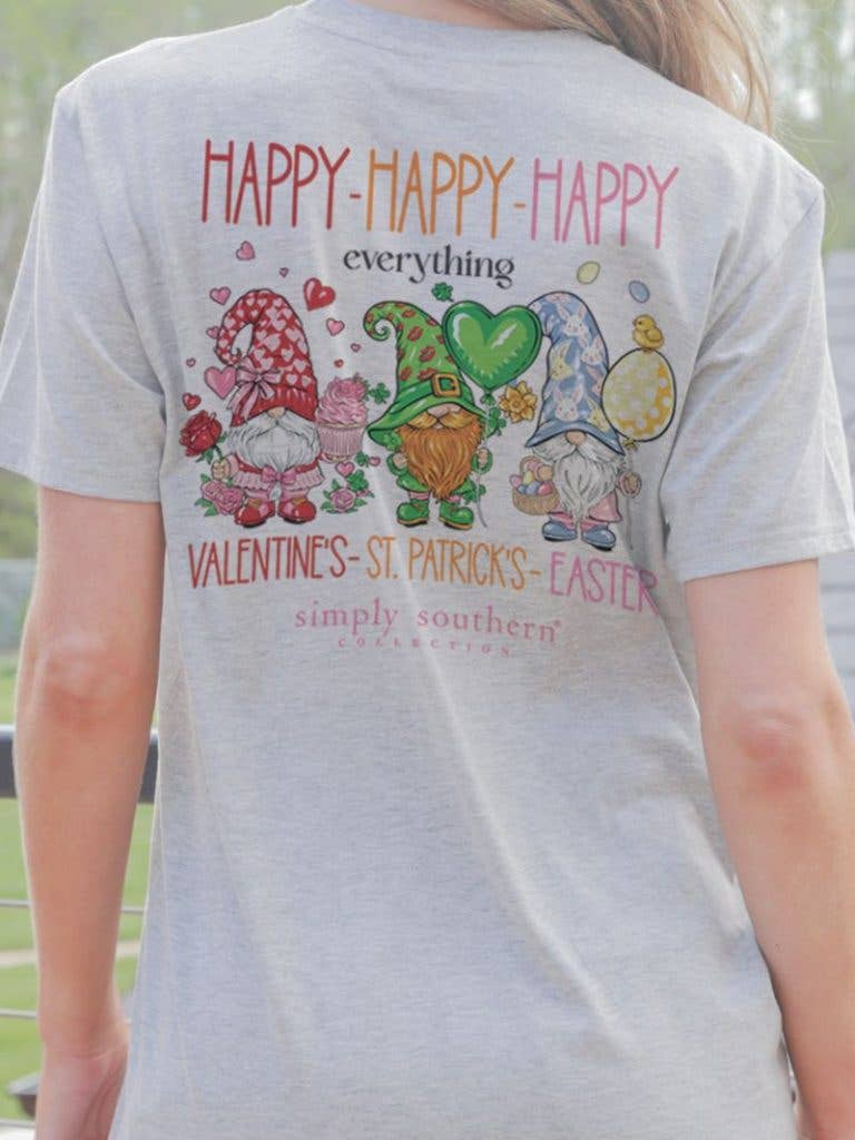 Ash grey sleeve shirt with the phrase 'Happy happy happy Valentine's, St. Patrick's, Easter and three gnomes representing each holiday. Simply Southern logo below and on left chest. The phrase 'Happy Everything' on the left chest. 100% cotton. Unisex youth sizing.