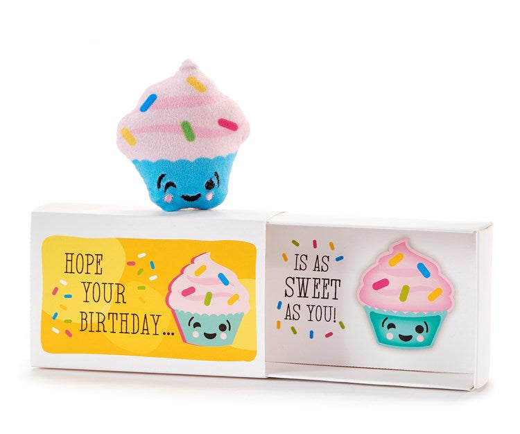 Cupcake plush token with HOPE YOUR BIRTHDAY IS AS SWEET AS YOU! sentiment gift box. These cute little boxes hold little inspiring messages, charming, clever and ever so meaningful. So easy to pop into a pocket or tuck away on a shelf for times when you need a little thoughtful hug to brighten your day.