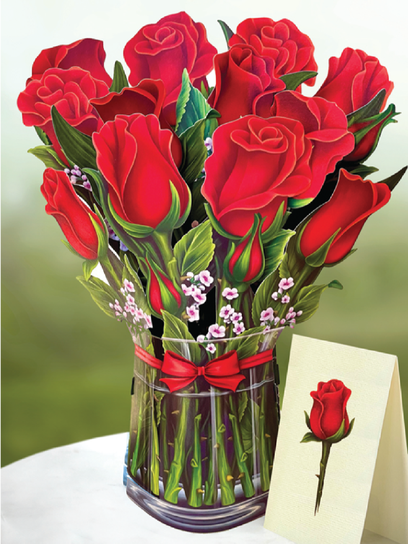 Red Roses (Flowers with envelope + notecard). Each pop up flower card includes a small blank coordinating notecard. This classic Bouquet boasts a full dozen Red Roses, with a sprinkling of Baby’s Breath. Show your love to your sweeties, crushes, teachers, mothers, kiddos, and cuties with these timeless beauties. These are perfect for Valentine's Day, anniversaries or just because!