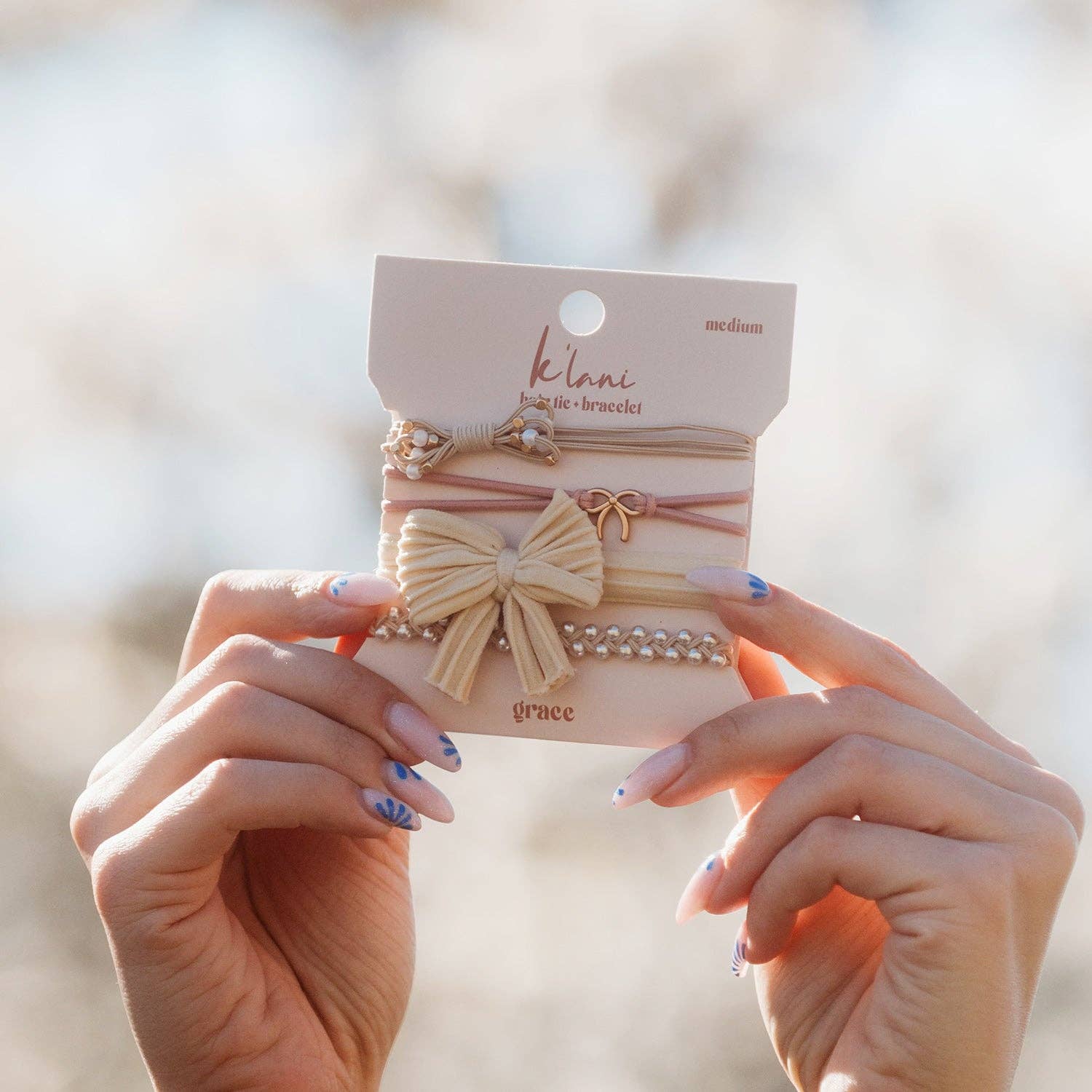 Our Grace set of hair tie bracelets brings trendy femininity with its fusion of pearls, gold accents, and dainty bows.  Each bracelet is perfect for adorning wrists and embellishing your hair.  We all deserve a touch of grace now and then.