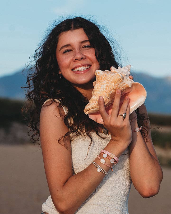 Our Shimmer set includes five bracelets that double as hair ties in beautiful corals and creams inspired by the shimmery seashells washed up on the beach. The set features shells, pearls, and silver beads that will surely bring the sandy and salty vibes of the beach to your everyday life.