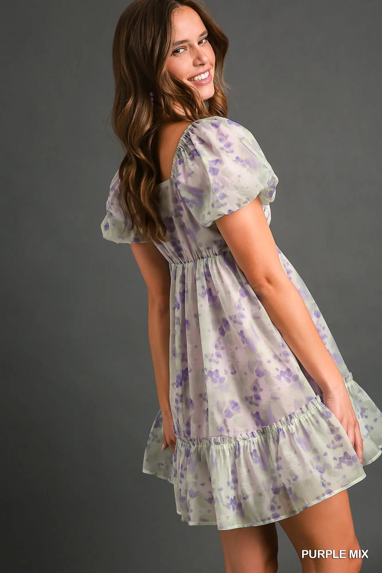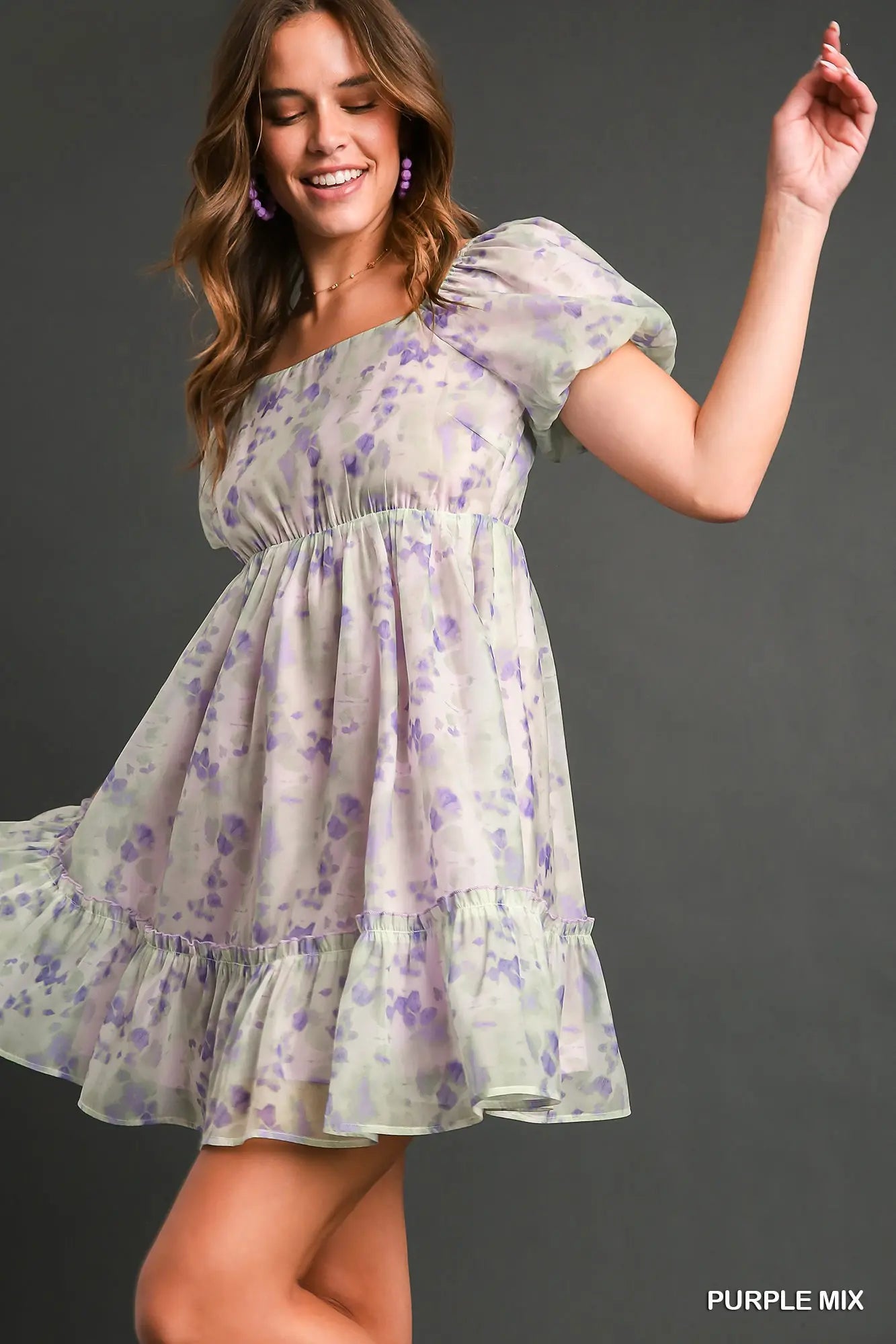 Lurex Floral Print Tiered A-Line Short Dress & Ruffle Layered Sleeves