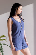 Comfy and chic, this sleeveless romper features a round neckline, ribbed fabric, side pocket, and front buttons. Dress it up or down—it's your go-to piece for looking put-together with zero effort.