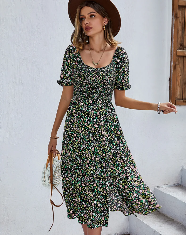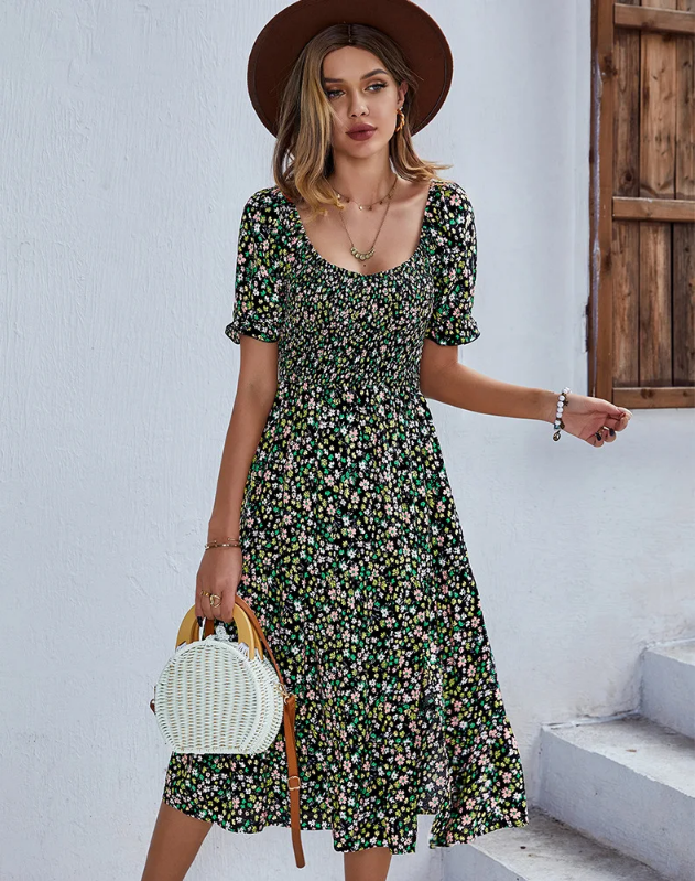 Bohemia Floral Puff Sleeve High Waist Flounce Sleeve Dress