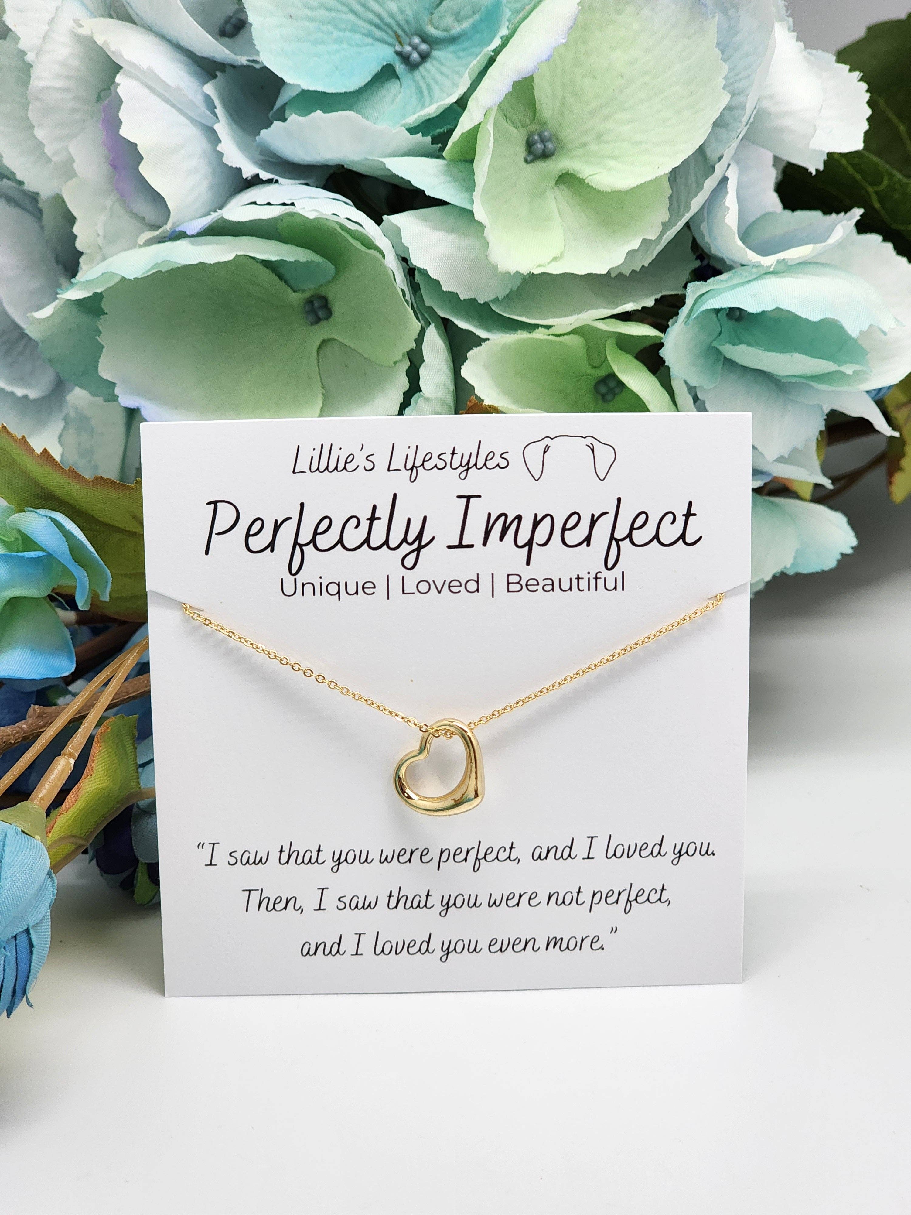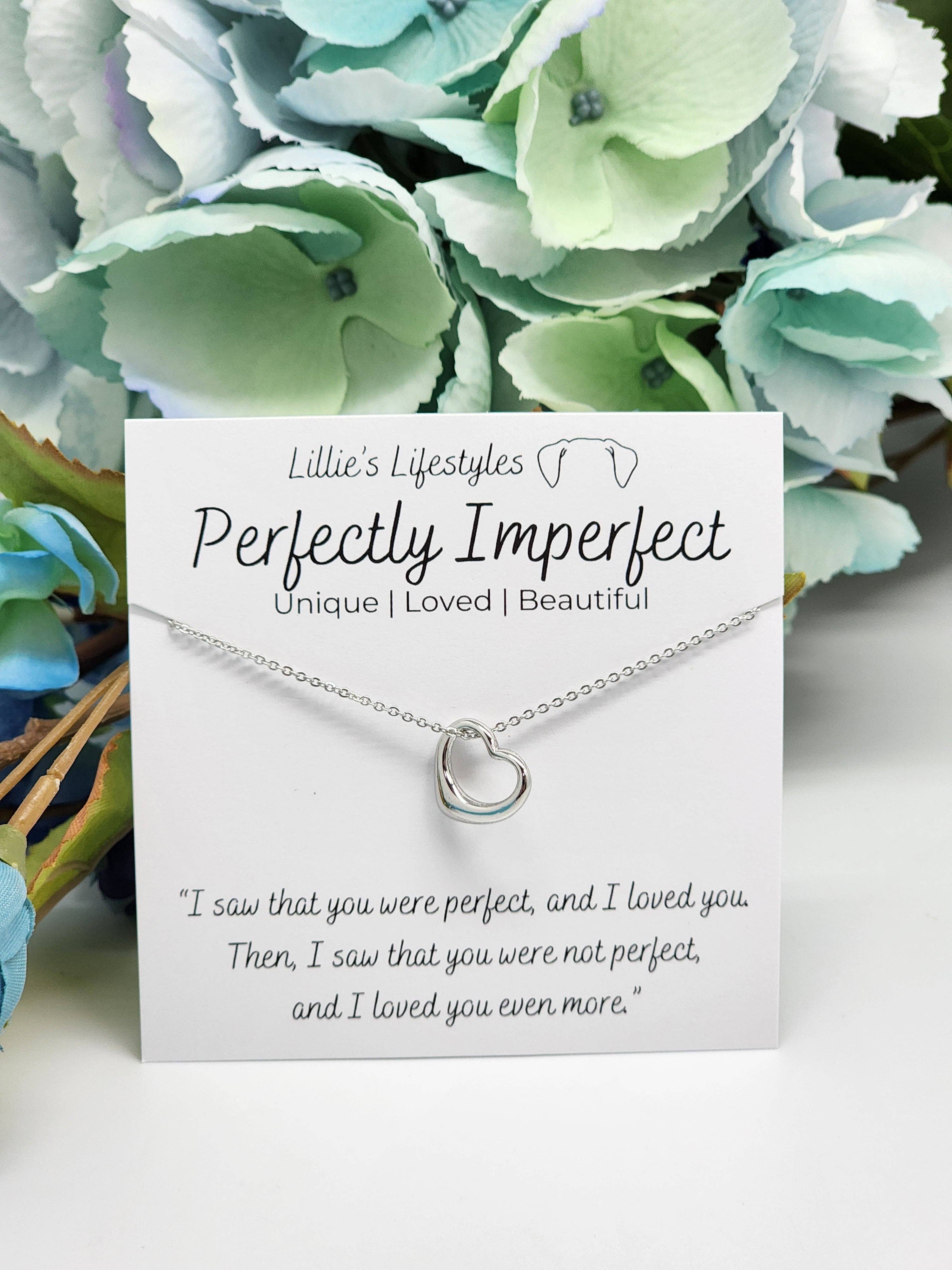 The Perfectly imperfect pendant represents Unique, Loved and Beautiful. “I saw that you were perfect, and I loved you. Then, I saw that you were not perfect, and I loved you even more.” All of our necklaces come with our signature gift box.
