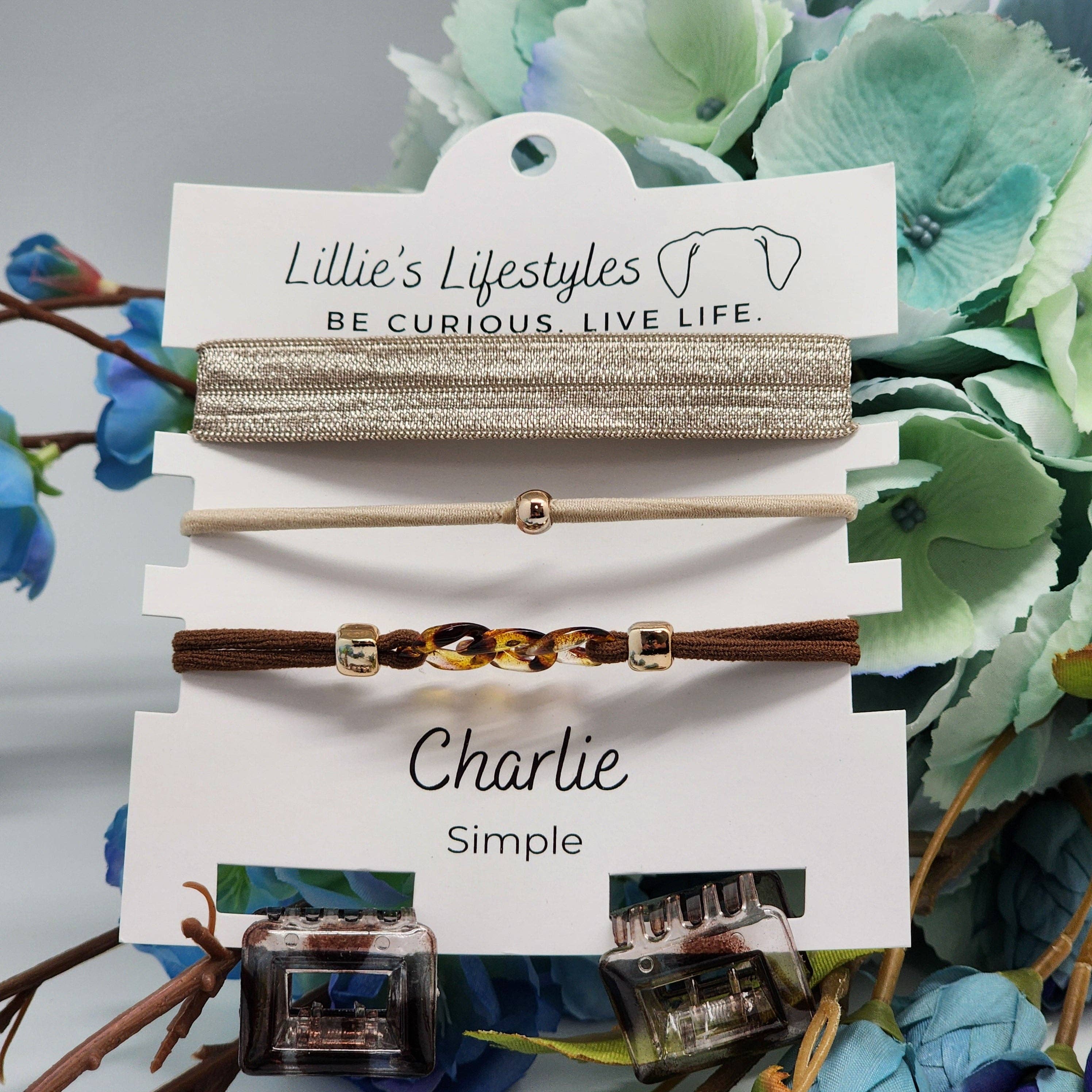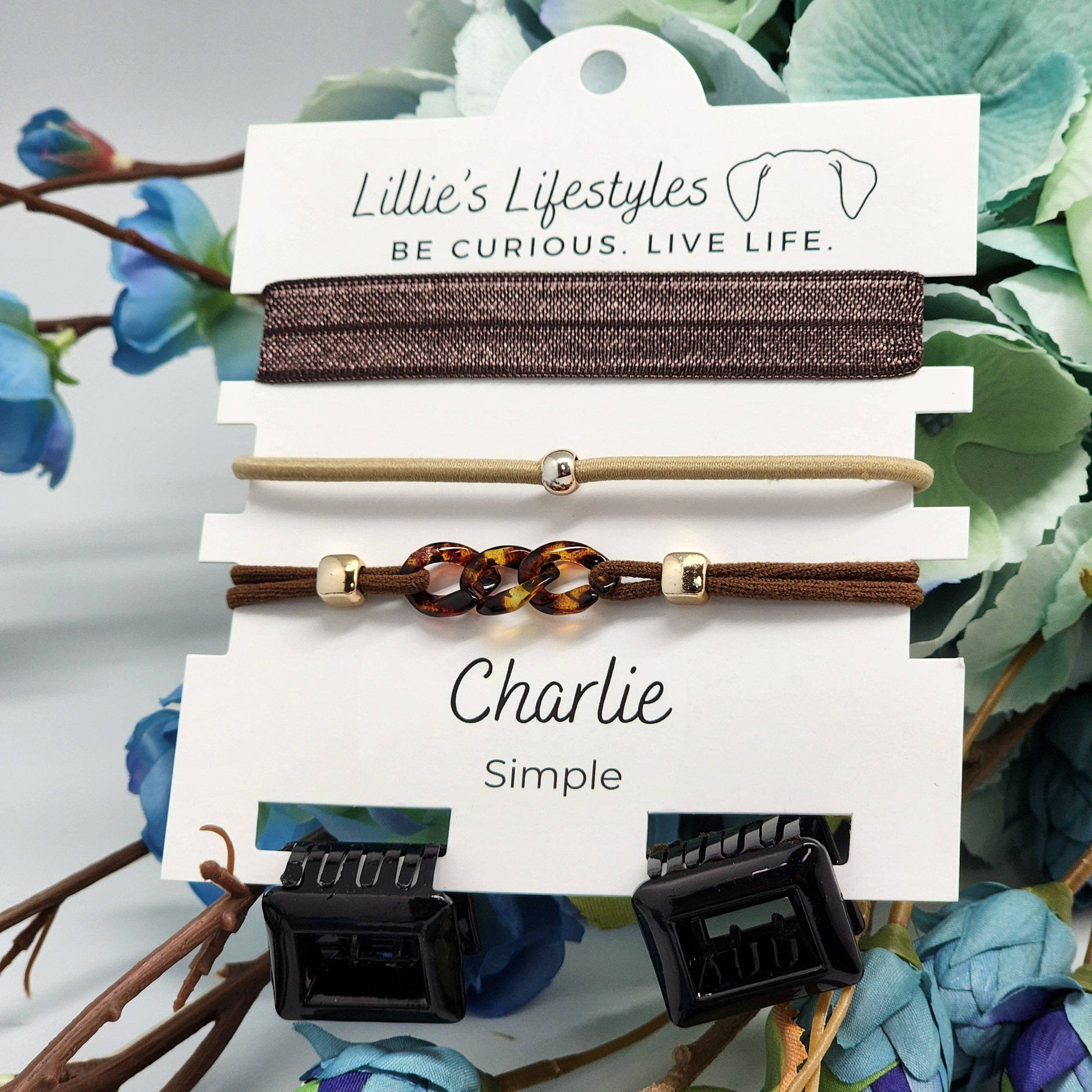 New from Lillie's Lifestyles, a set of hair clips and holders in neutral shades that will coordinate with everything! Lillie's Lifestyles hair tie bracelets can be used as a bracelet or hair band. An assortment of simple hair ties in black shades