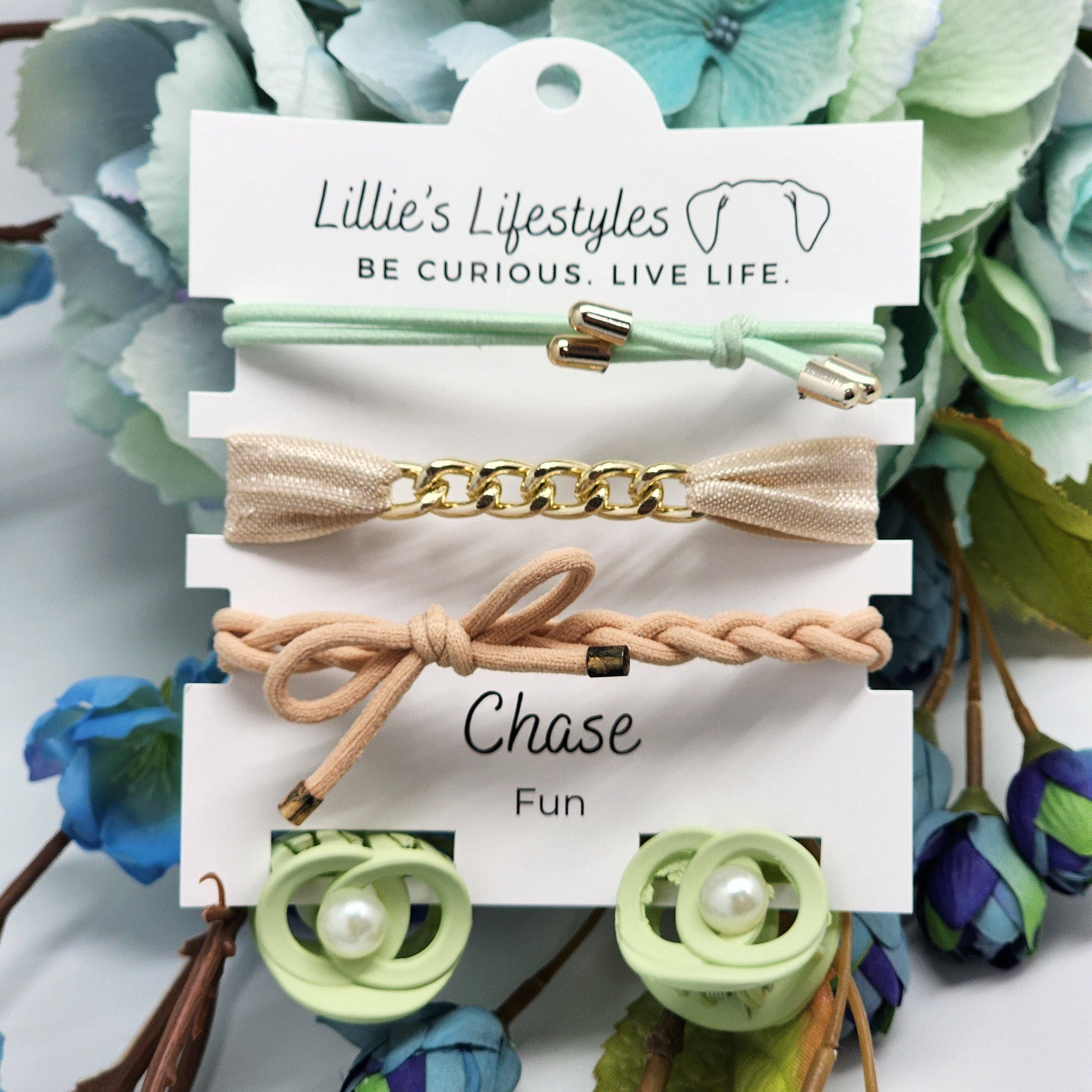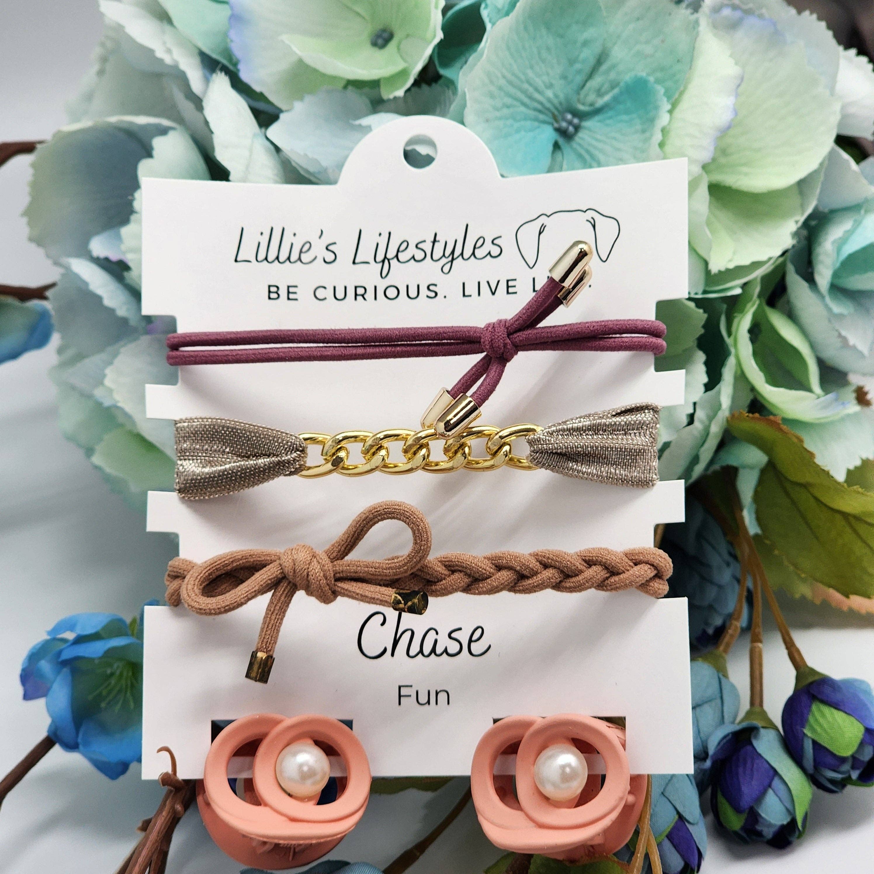 New from Lillie's Lifestyles, a set of hair clips and holders in neutral shades that will coordinate with everything! Lillie's Lifestyles hair tie bracelets can be used as a bracelet or hair band. An assortment of fun hair ties in green shades