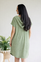 Effortlessly chic meets cozy comfort in this sage dolman hoodie mini dress. The relaxed V-neck and flowing dolman sleeves create an urban vibe, while ribbed detailing adds subtle texture and structure. Practical side pockets keep your essentials close, and the rounded hem gives it a modern, polished finish. Perfect for lazy days that still demand style—throw it on and go.