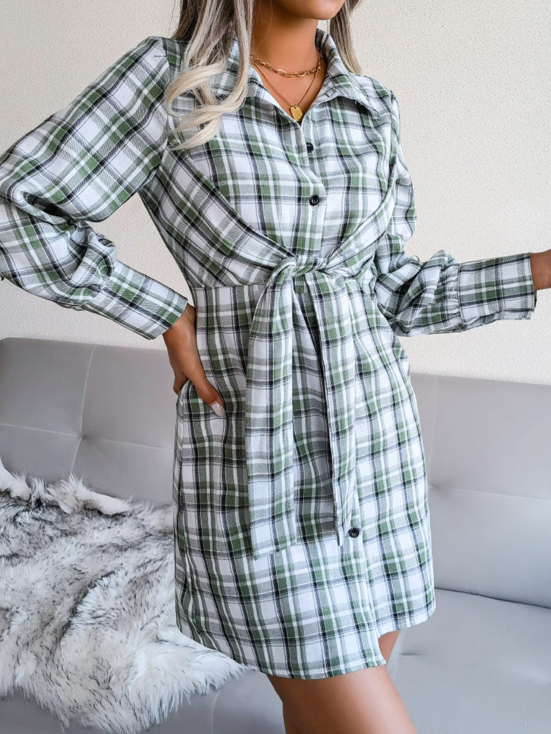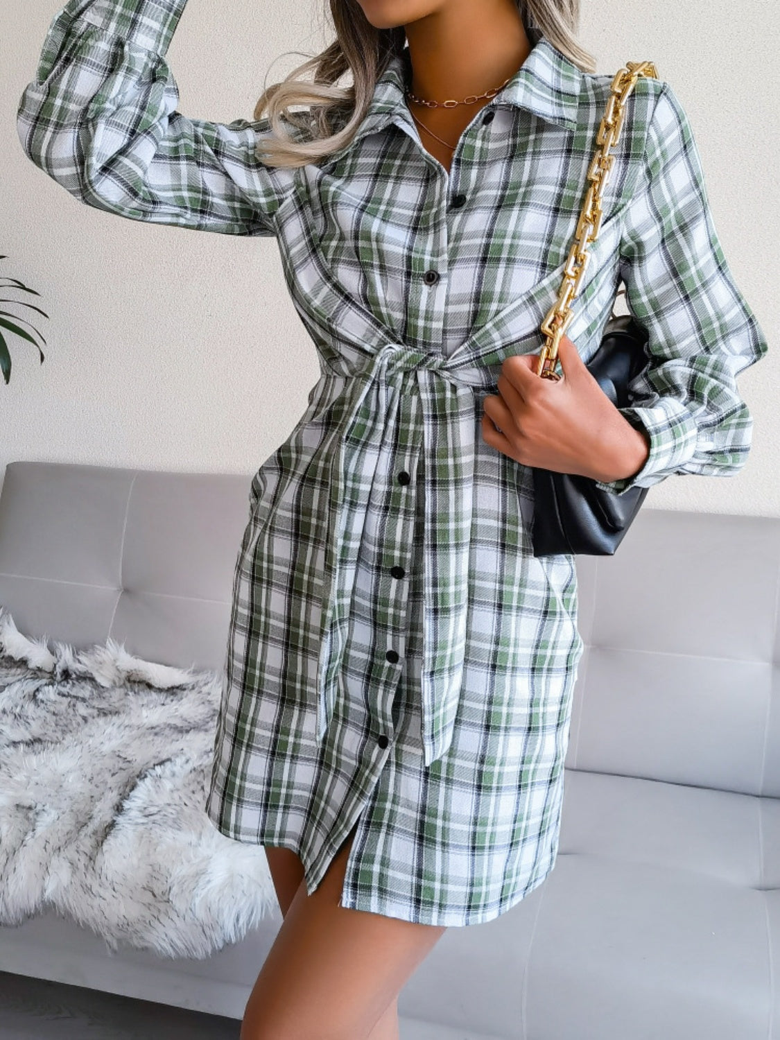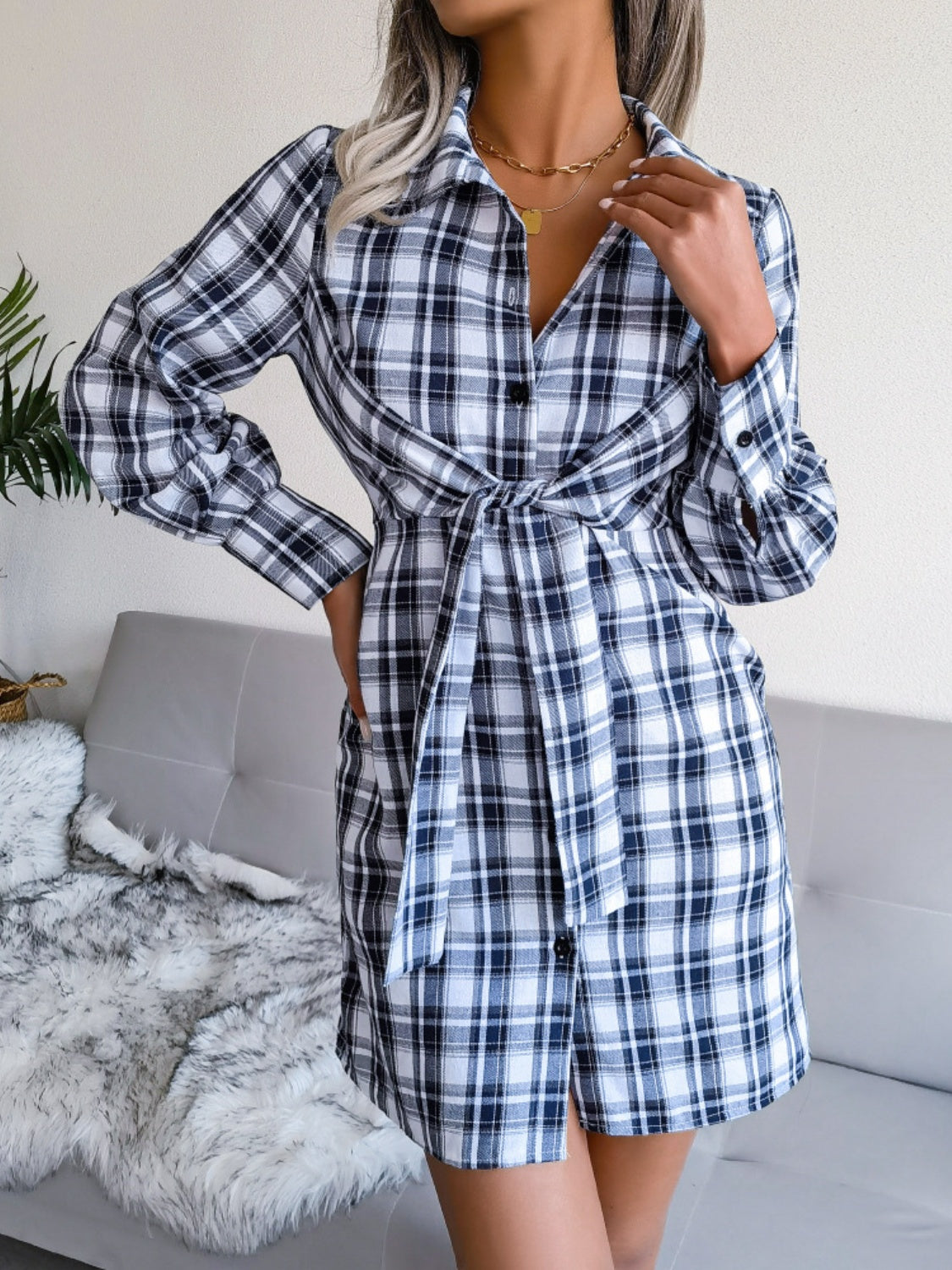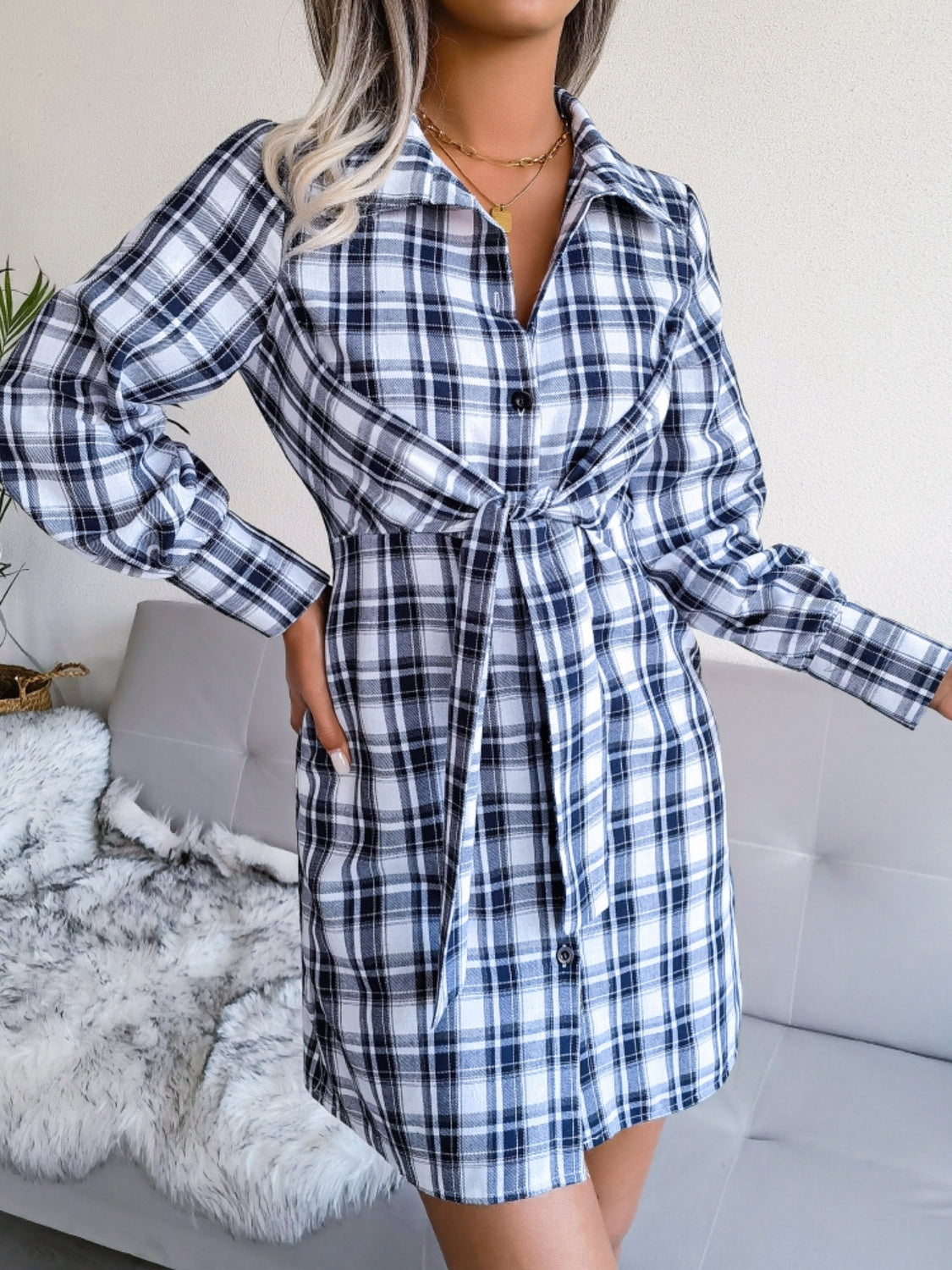 Tied Plaid Long Sleeve Mini Shirt Dress ~ Online Only