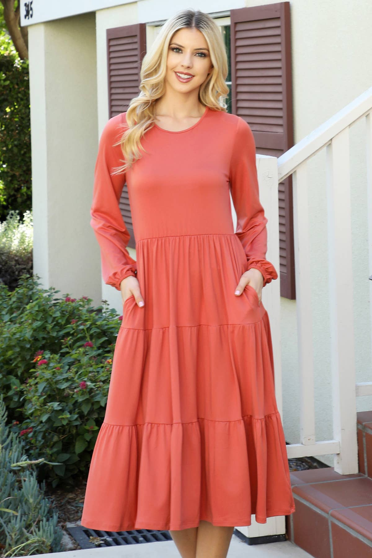 Pam ~ Solid Elastic Waist Tiered Dress: Terracota *Final Sale*