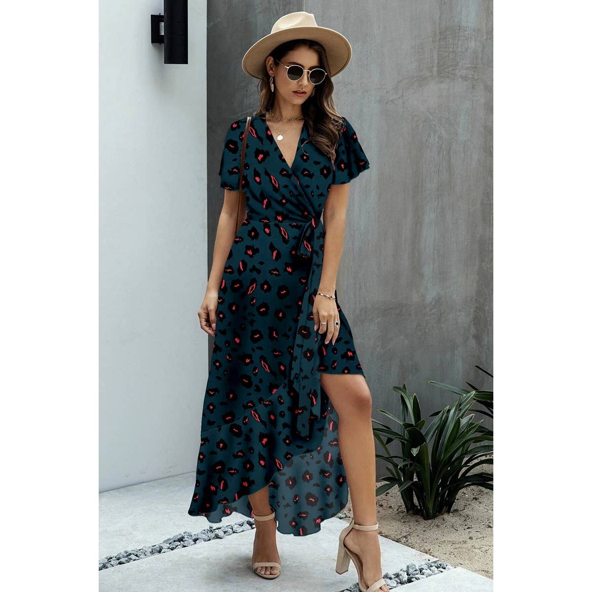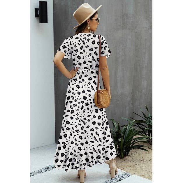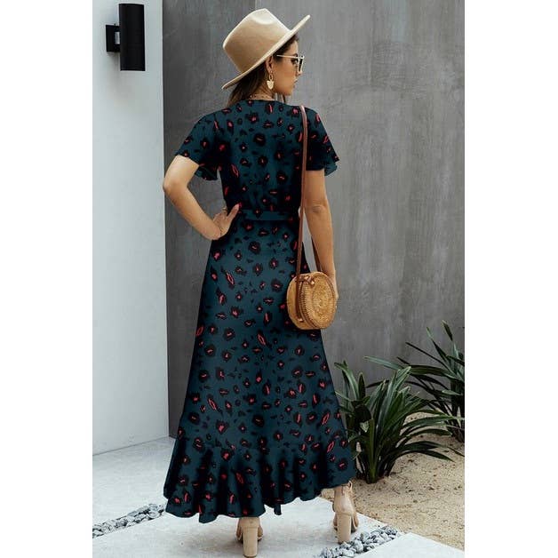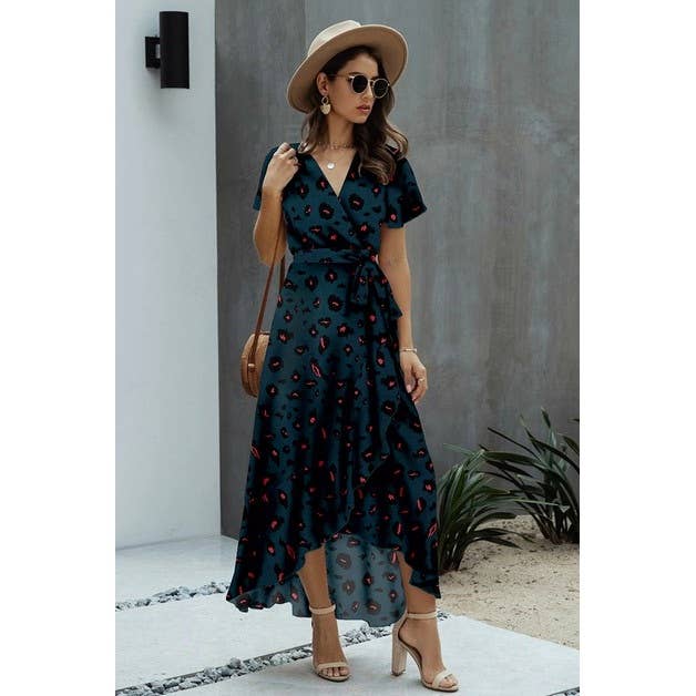 Material: the material is breathable, light weight fabric, soft and comfy. Features: V Neck, Short Sleeve, Flower Detail, Animal Print, Waist Tie, Asymmetric Hem, Midi Dress, Fitted, Casual. Occasion: Casual/Daily/Outdoor/Vacation/Holiday/School/Going Out.