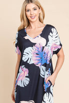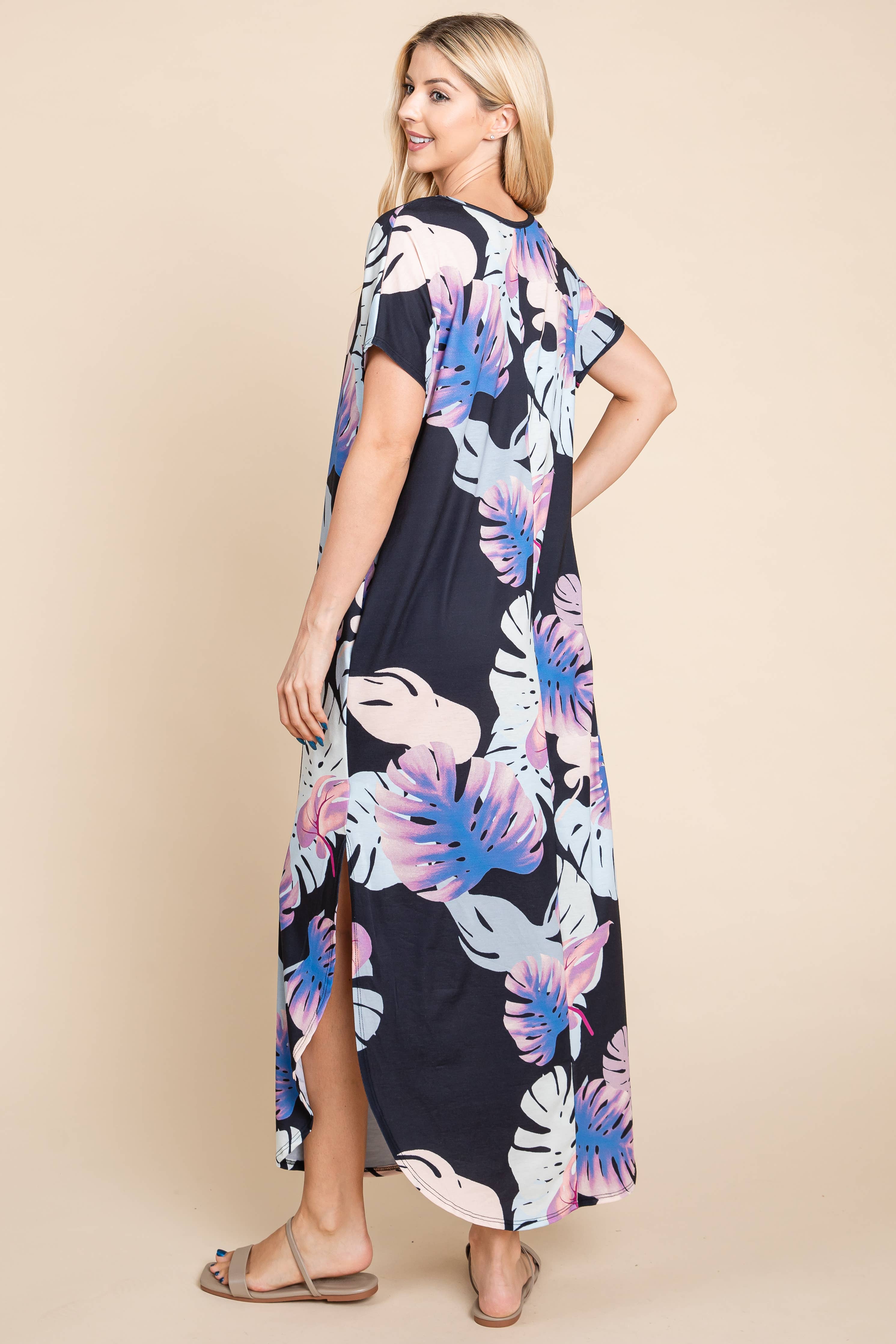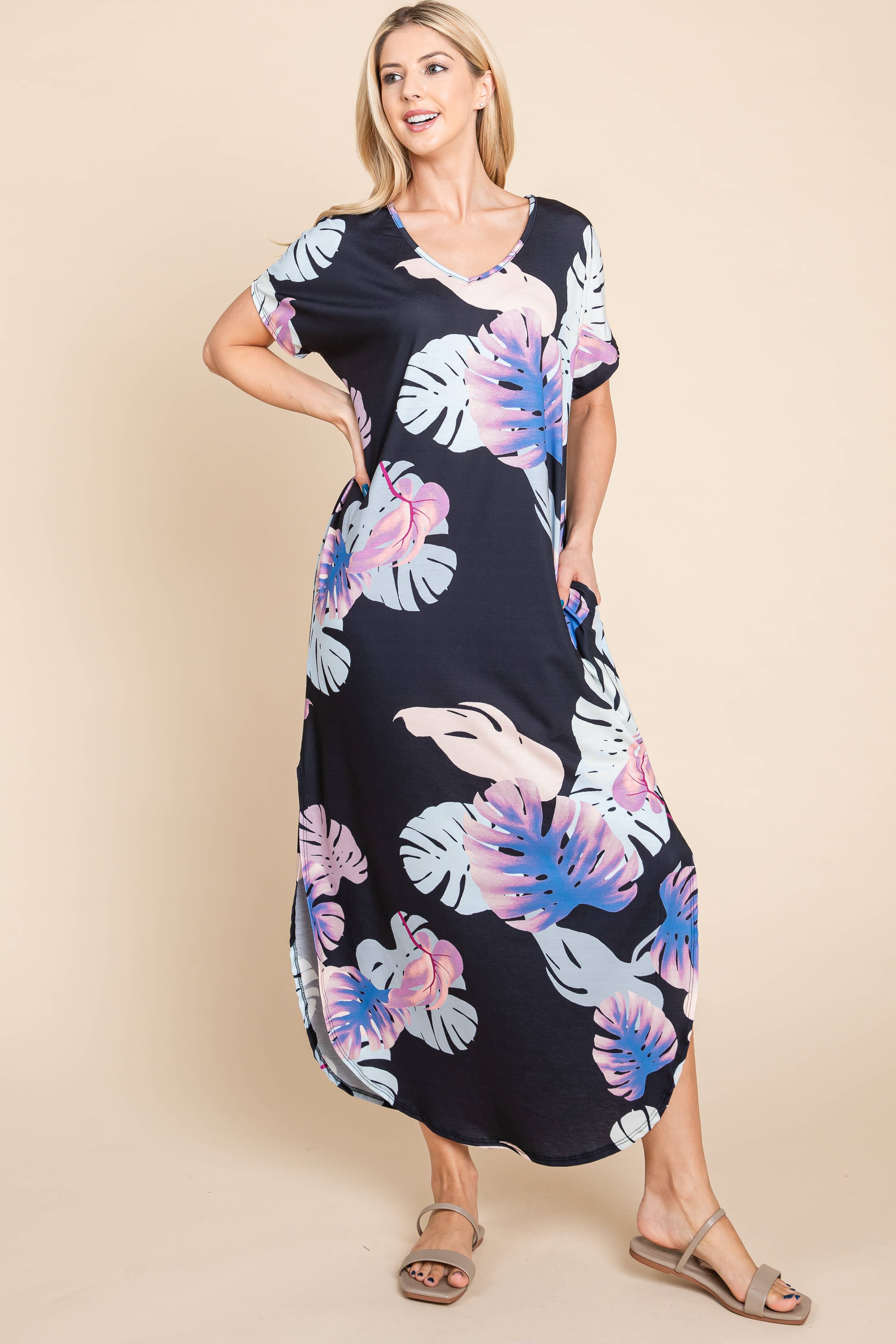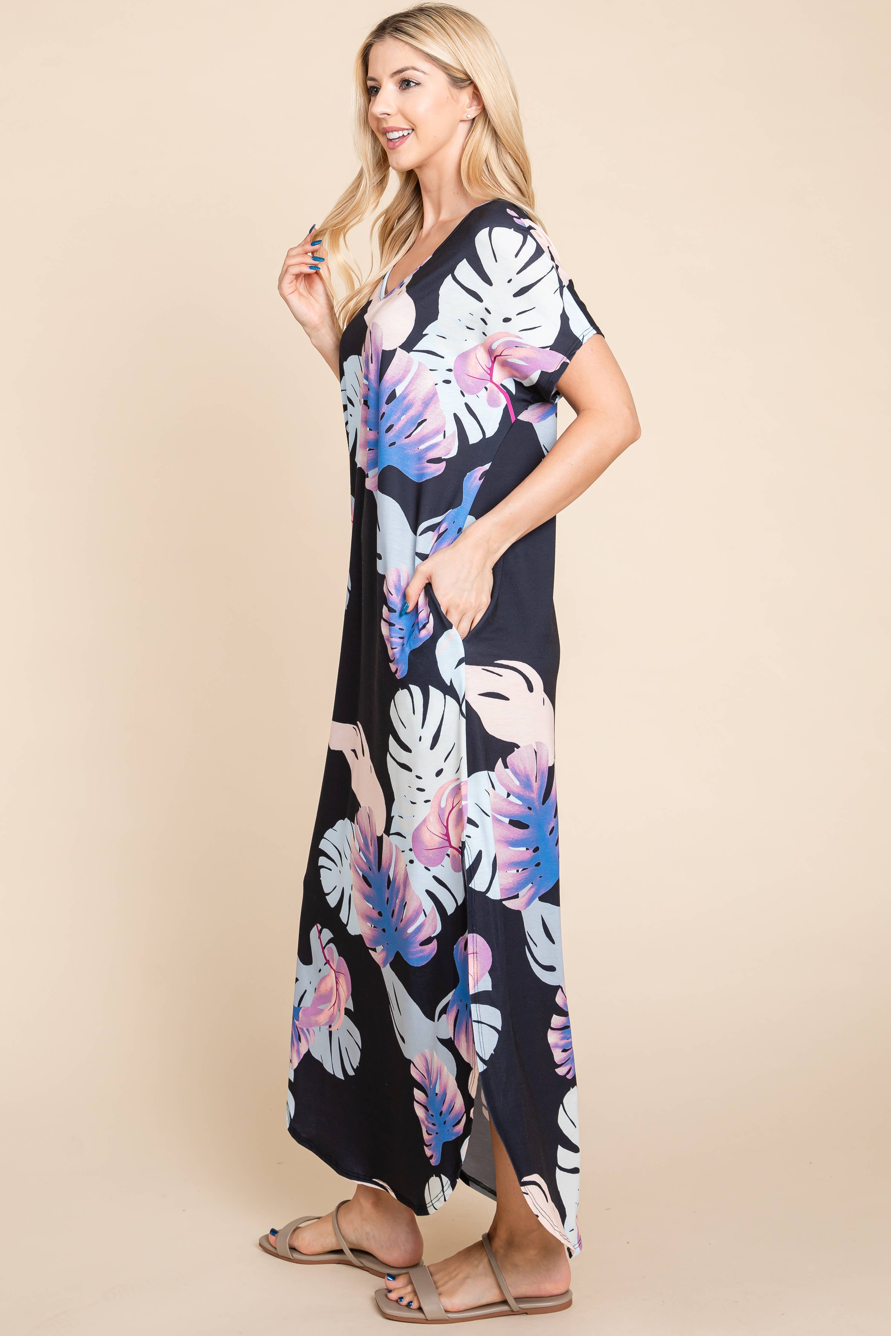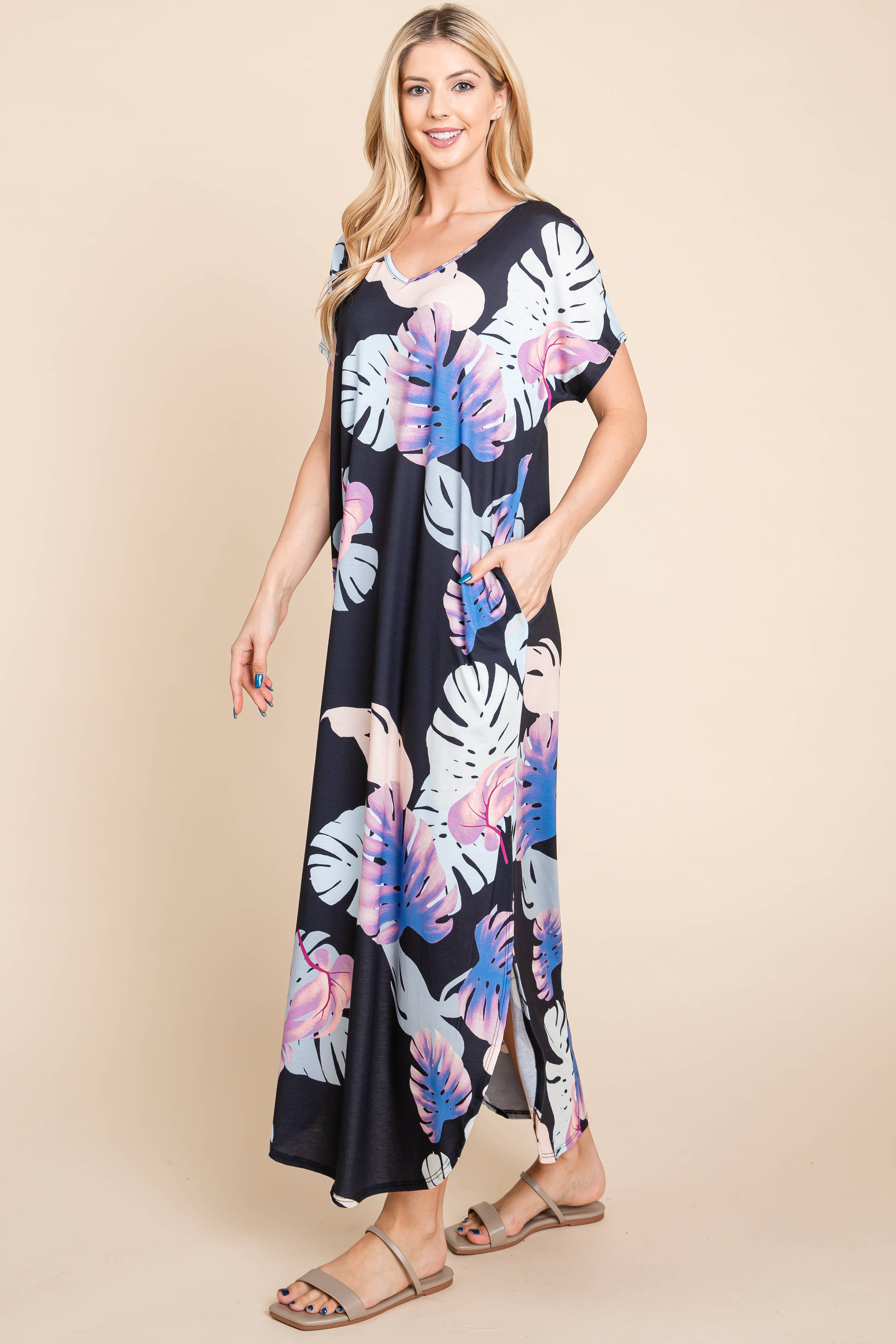 FLORAL PRINT SIDE POCKETS SIDE SLIT MAXI DRESS