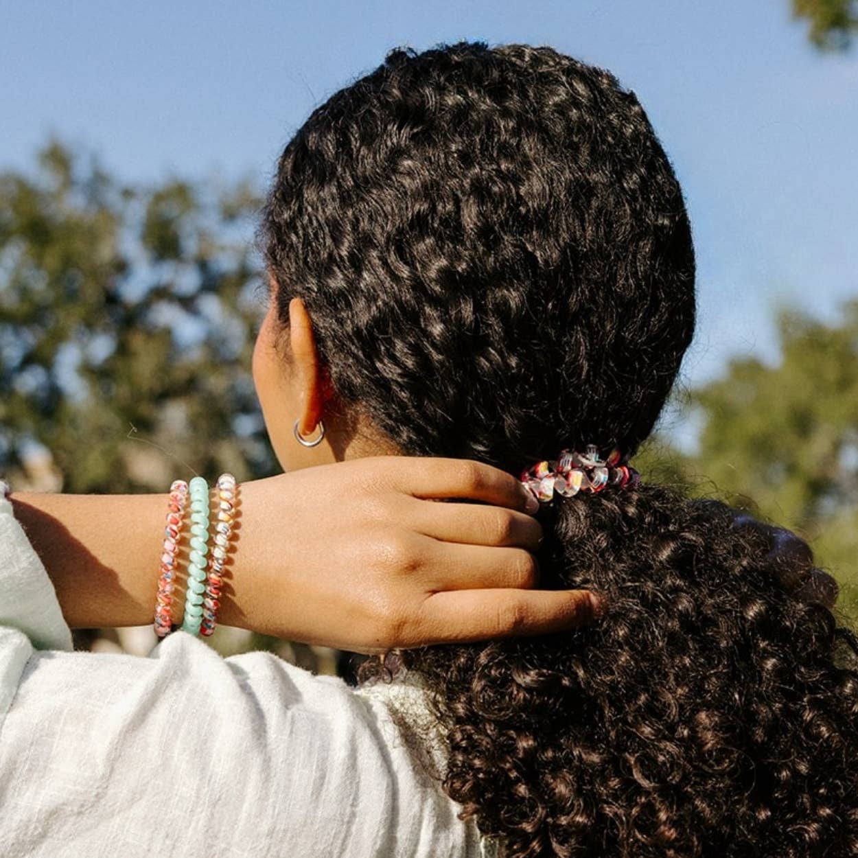 Spring Splash Large Hair Ties in Green and Pink offer a strong grip without damage, doubling as a chic wrist accessory when not in use. Your new favorite hair essentials all year round.