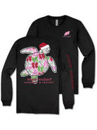 Black long sleeve shirt with the silhouette of an sea turtle wearing a santa hat and filled with dotted hair bows. Simply Southern logo below, on left chest, and along right sleeve. 100% cotton. Unisex sizing. Turtle tracker.