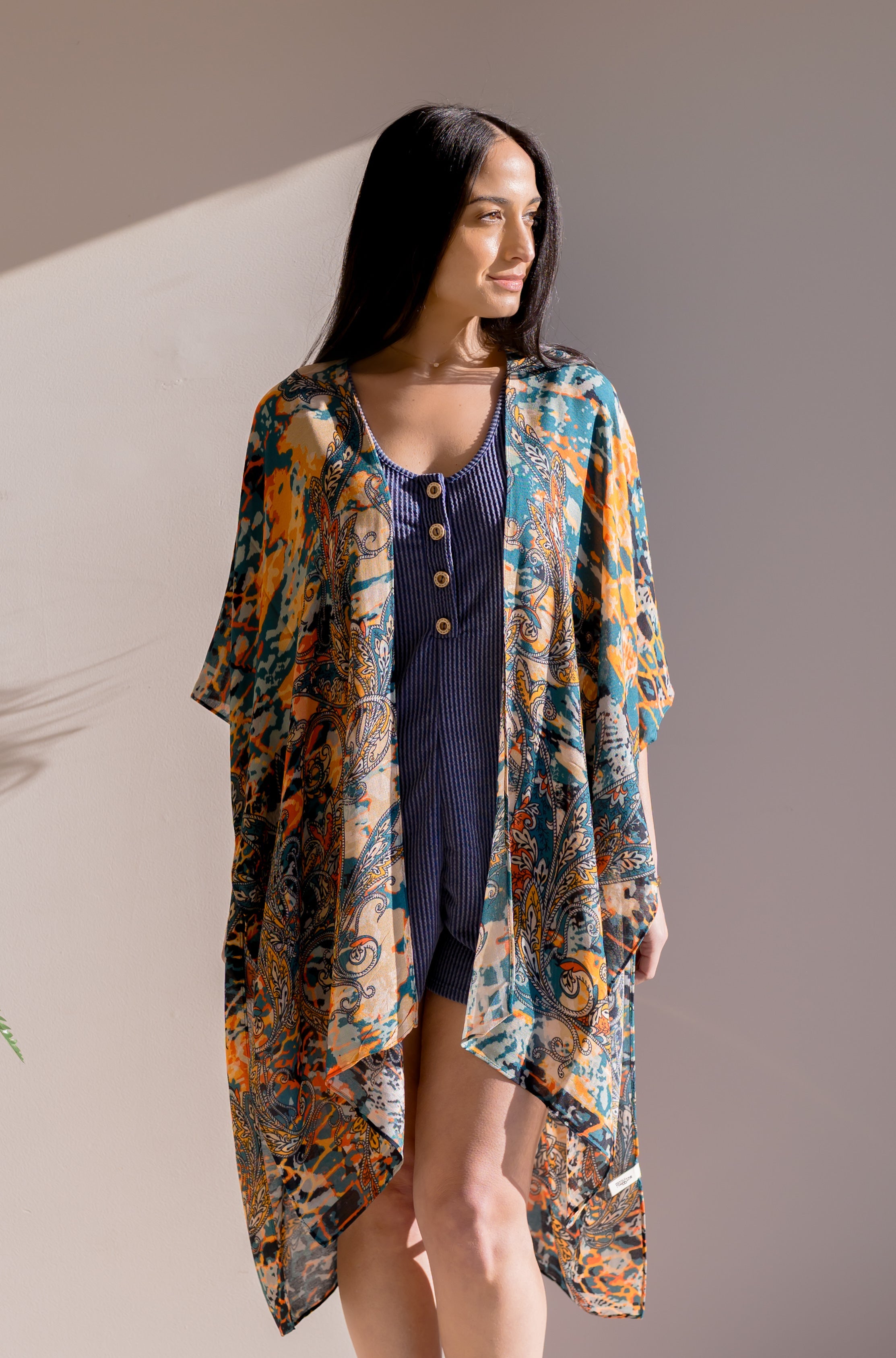 Make a bold entrance with the Dune Wild Kimono, where nature's most vibrant hues come alive. Teal, magenta, green, and orange florals swirl across a moody dark base, creating an instantly wearable work of art. This airy, lightweight layer transforms your everyday style into something unforgettable—the kind of piece that stops people mid-conversation. Ready to turn heads and embrace your inner wildflower?