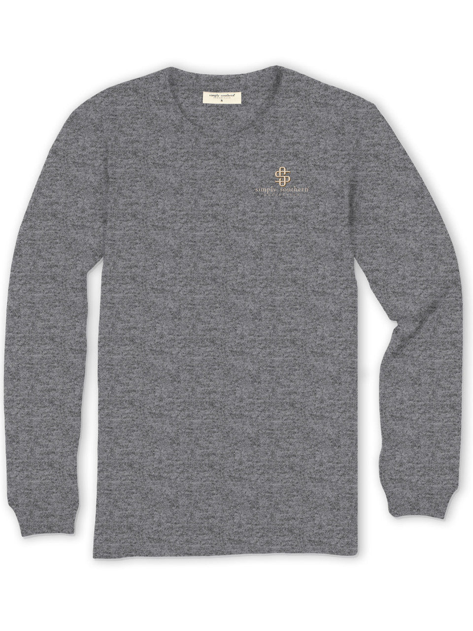 Dark heather grey long sleeve shirt with the phrase 'Just a girl who loves books' and a stack of books with an iced coffee on the side. Simply Southern logo below, on left chest, and along right sleeve. 100% cotton. Unisex sizing.