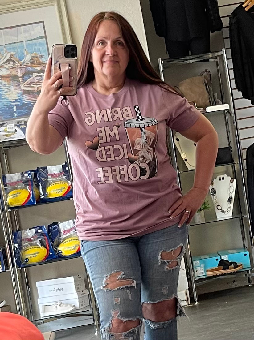 Bring me some iced coffee what better way to start the day or even get to pick me up at 3 o’clock? Bella canvas T-shirt, super soft comfortable. Georgeanne is wearing a large which is her normal size.