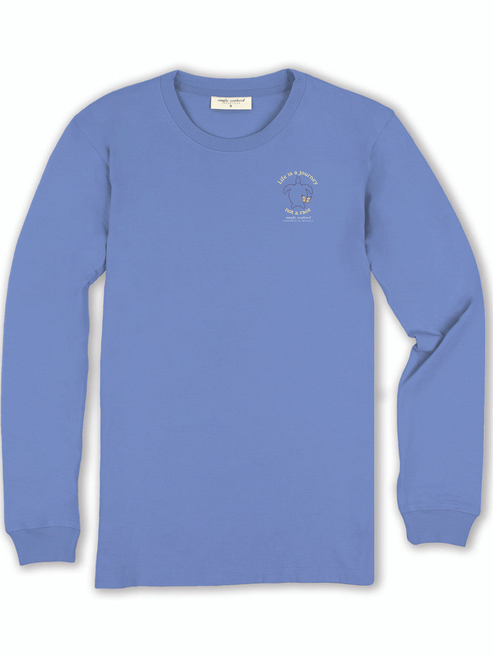 Vista blue long sleeve shirt with the phrase 'Life is a journey not a race' and a sea turtle silhouette filled with a beautiful nature scene. Simply Southern logo below, on left chest, and along right sleeve. 100% cotton. Unisex sizing. Track shirt.