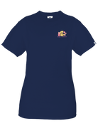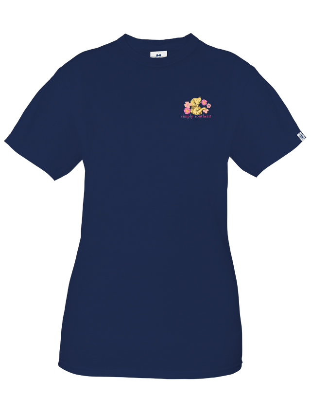 Navy blue short sleeve shirt with a dog and flower mosaic and the phrase 'Just a girl who loves her dog'. Simply Southern logo below and on left chest. 100% cotton. Unisex sizing.