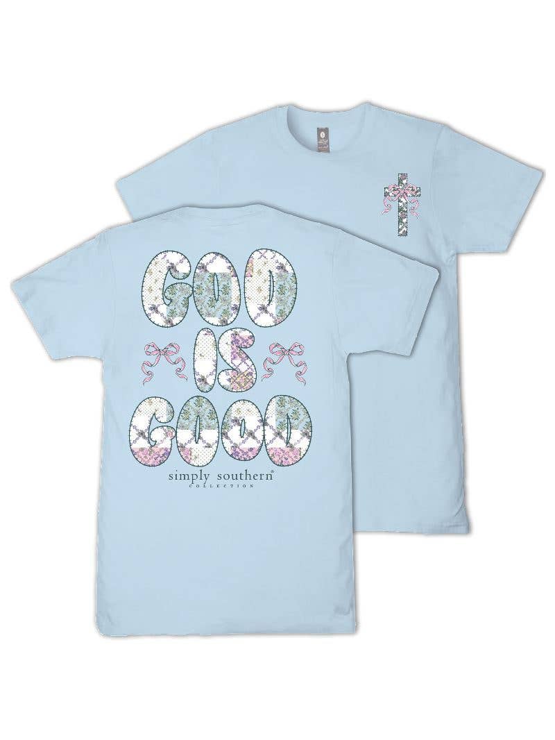 Made from 100% soft, breathable cotton, this short sleeve basic tee delivers all-day comfort in a clean, classic cut. This ice blue tee features the phrase 'God is good' with floral quilted lettering.