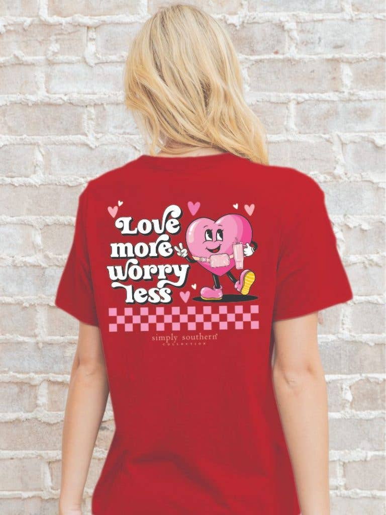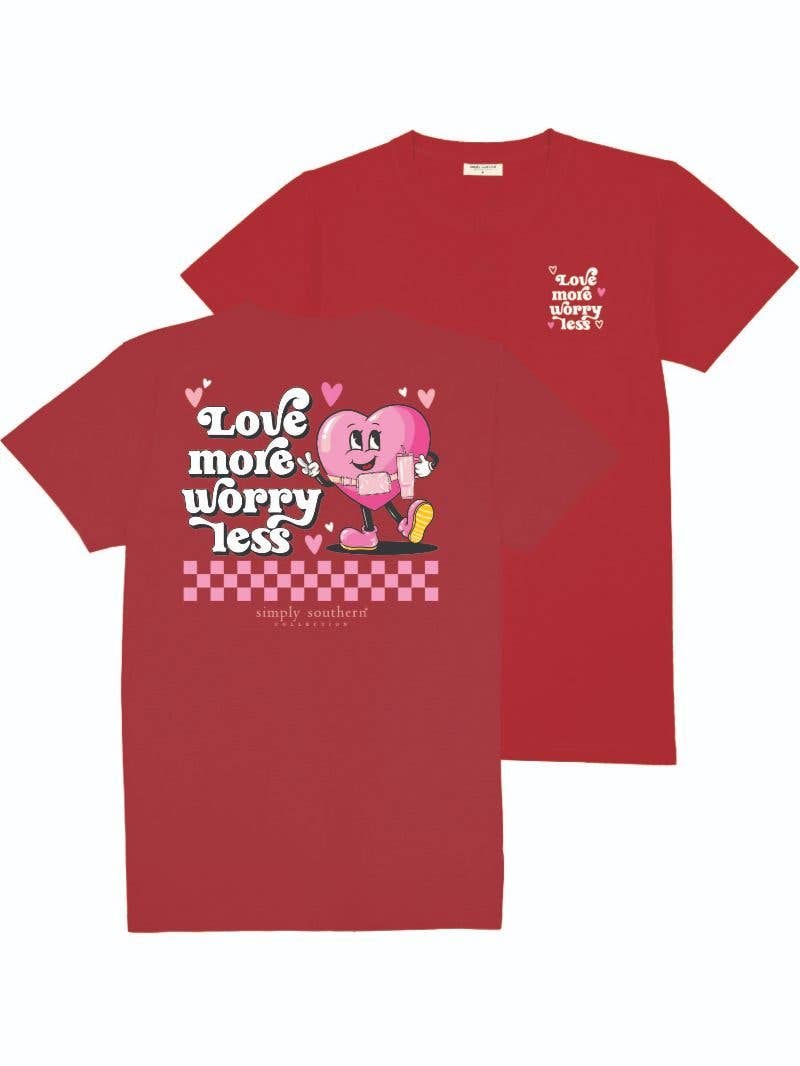 Red short sleeve shirt with phrase 'Love more worry less'. A heart wearing a belt bag and holding out a peace sign with one hand, tumbler with other hand. Checker print and hearts surrounding. Simply Southern logo below. 'Love more worry less' on front chest. 100% cotton. Unisex sizing.
