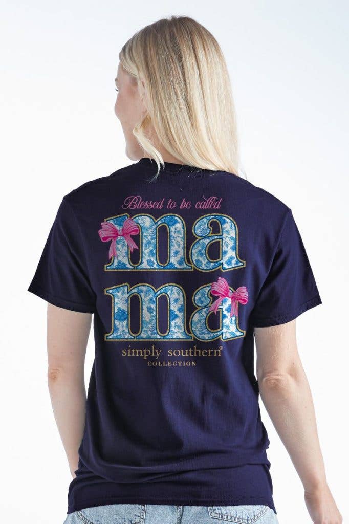 Navy blue short sleeve shirt with the phrase 'Blessed to be called mama'. The word 'mama' is filled with a blue rose motif, outlined in gold glitter, and adorned with pink bows. Simply Southern logo below. Similar design on left chest. 100% cotton. Unisex sizing.