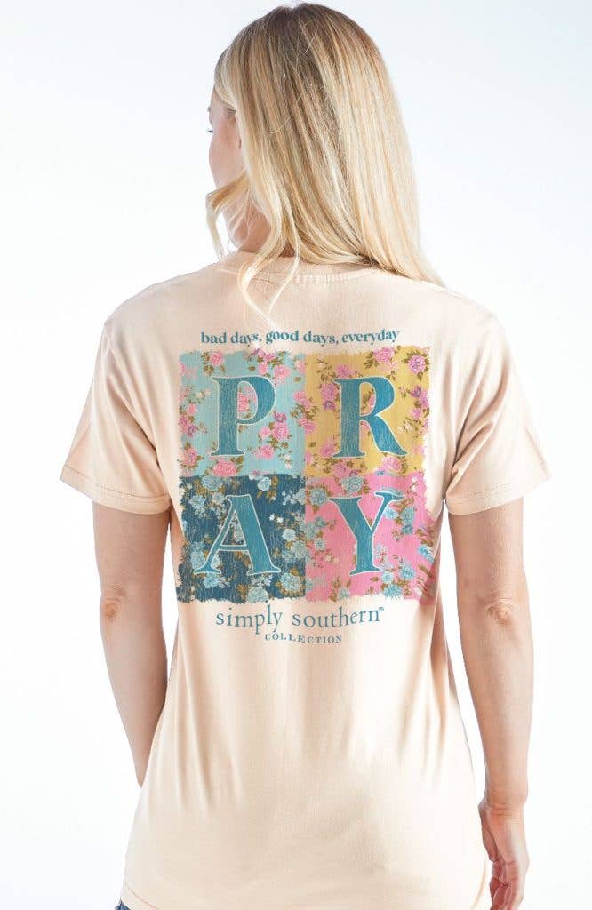 Natural tan short sleeve shirt with the phrase 'bad days, good days, everyday pray' with the letters of the word 'pray' each being in a quilted block filled with roses. Simply Southern logo below and on left chest. Unisex sizing.