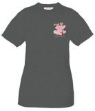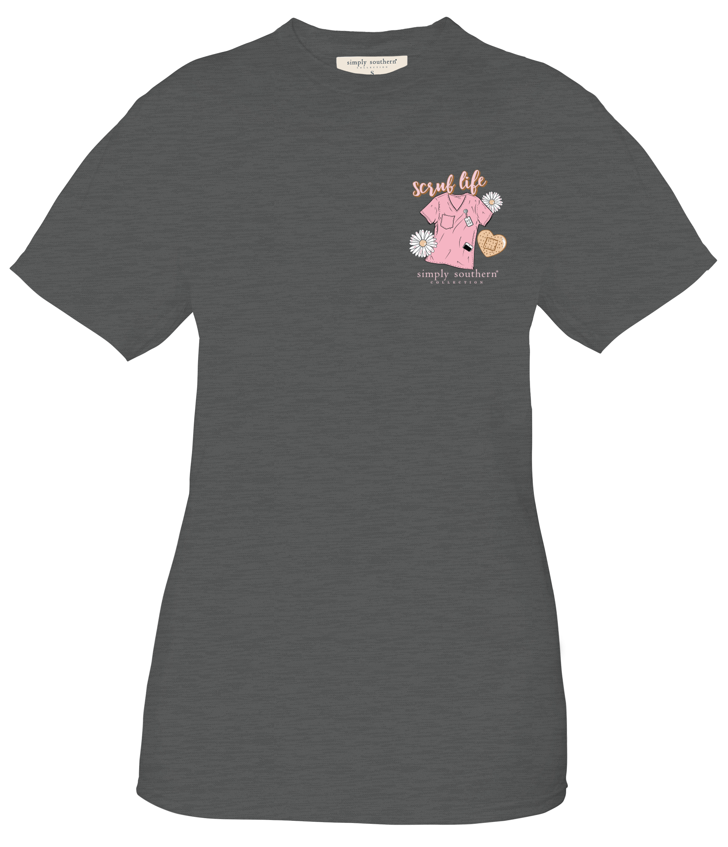 Dark grey short sleeve shirt with the phrase 'scrub life' and a set of scrubs with nursing tools surrounded by hearts and flowers. Simply Southern logo below. Similar design on left chest. Pre-shrunk and ring-spun 100% cotton. Unisex sizing.
