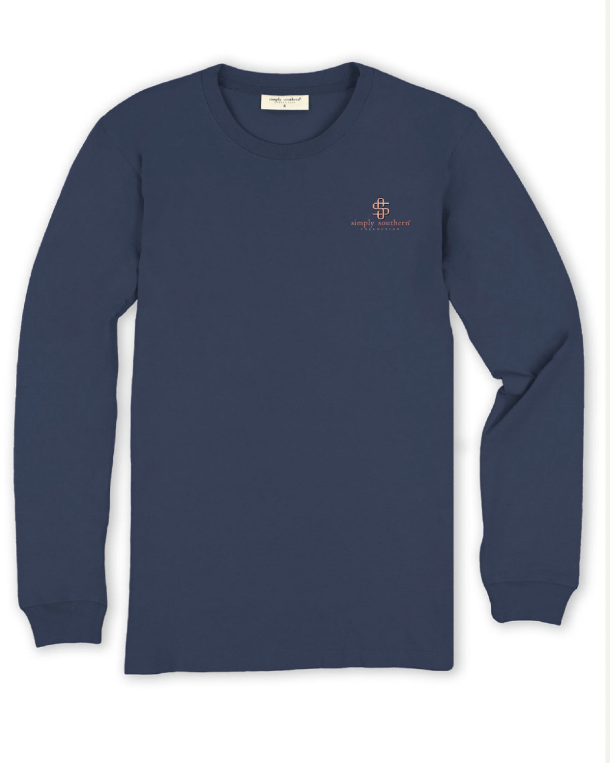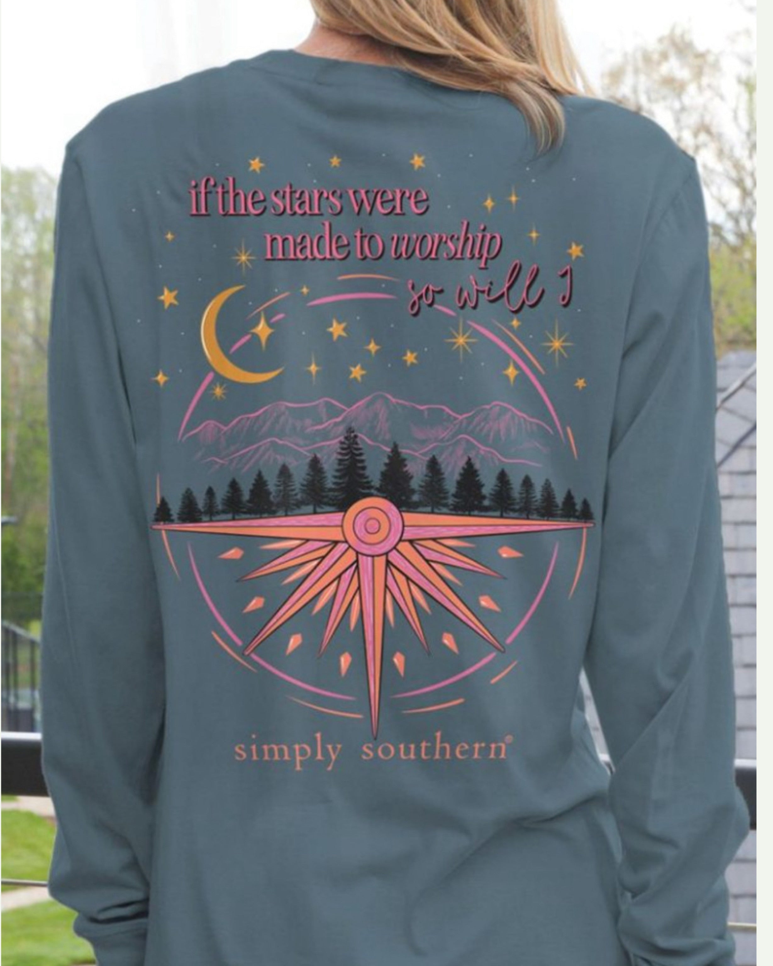 Mirage blue long sleeve shirt with the phrase 'if the stars were made to worship so will I' and a compass with the top half being a night sky. Simply Southern logo below, on left chest, and along right sleeve. 100% cotton. Unisex sizing.