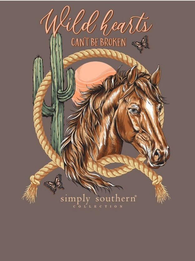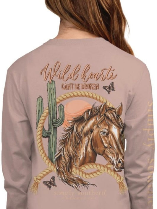Mocha long sleeve shirt with the phrase 'Wild hearts can't be broken' and a horse and cactus framed with rope. Simply Southern logo below, on left chest, and along right sleeve. 100% cotton. Unisex youth sizing.