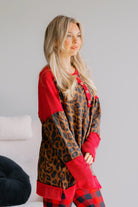 Bring a bold twist to your cozy look with the Wild Sleigh Knit. This playful sweater features a vibrant red and leopard print knit that stands out in any crowd. The half-button-up design adds a fun, flirty touch while making it easy to layer or wear on its own. Perfect for mixing comfort with eye-catching style.