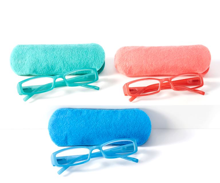 Featured in bright acrylic lacquers, these pouched reading eyeglasses are crafted to keep your reading habits fueled. Features include a spring hinge for added flexibility. Available in protective fiber cases in 3 assorted colors: Crisp Pink, Mint Green, Sea Blue. Strengths: +1.50/ +2.00/ +2.50. PC/Metal Frame. Acrylic lenses.