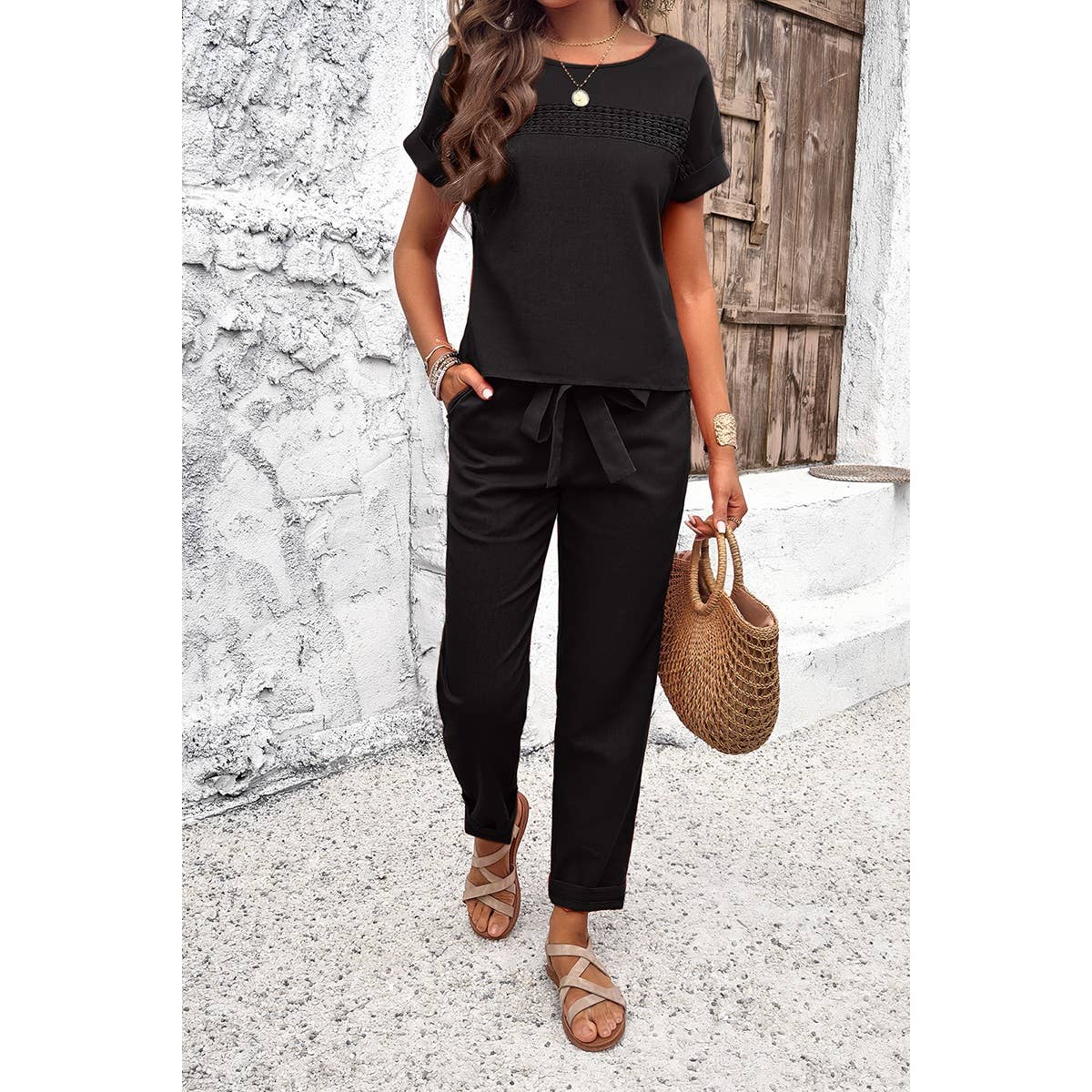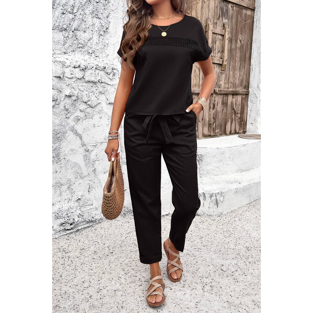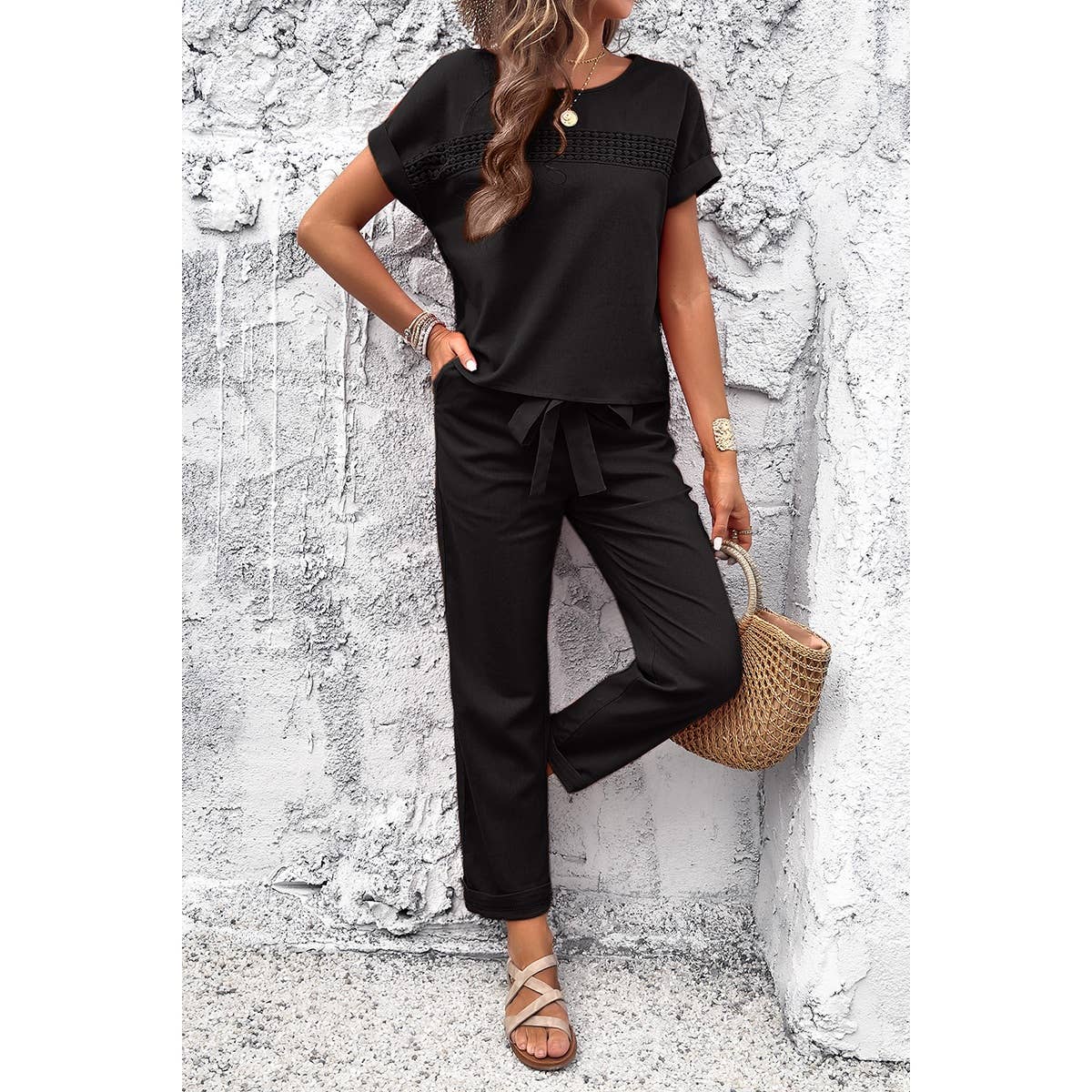Lauren ~ Round Neck Lace Trim Belt Pockets Two Pieces Sets: BLACK