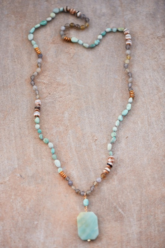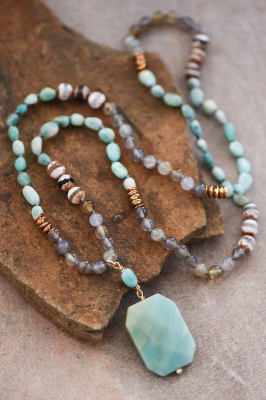 Amazonite stone pendant necklace. Mixed stone bead necklace. Approx. 30" L. Color, size, pattern may vary. Healing Crystal Necklace | Statement Necklace | Chunky Necklace | Protection Necklace | Long Necklace | Multi Gemstone Necklace | Boho Necklace | Natural Semi Precious Stone Necklace | Real Stone Necklace | Bead Necklace | Beaded Necklace | Large Crystal Pendant Necklace