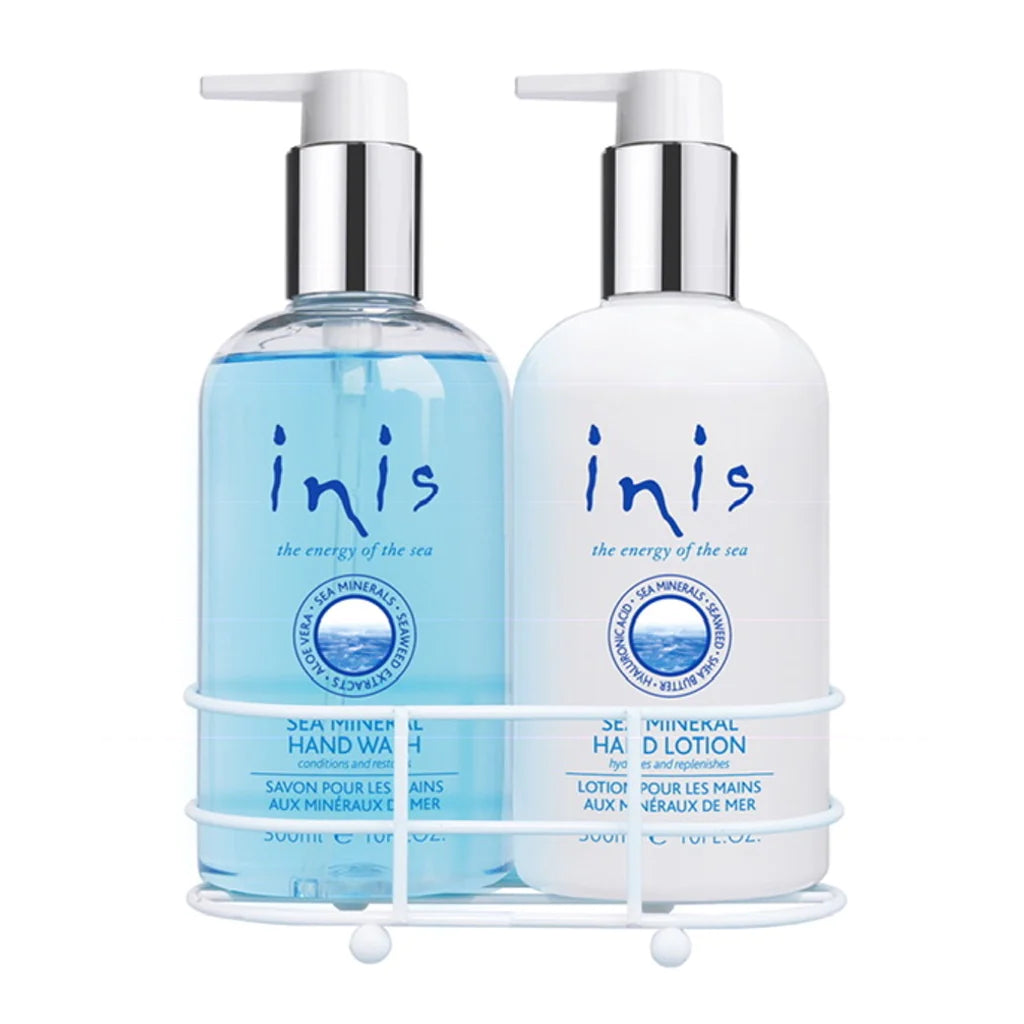 This hand care duo, which makes a great grab-n-go gift at a great value, includes a sea mineral hand wash and a hand lotion in a handy caddy. Perfect accent for any kitchen or bathroom! Energy of the Sea is their signature scent that captures the coolness, clarity and purity of the ocean. Inis contributes to the protection and conservation of Whales and Dolphins.