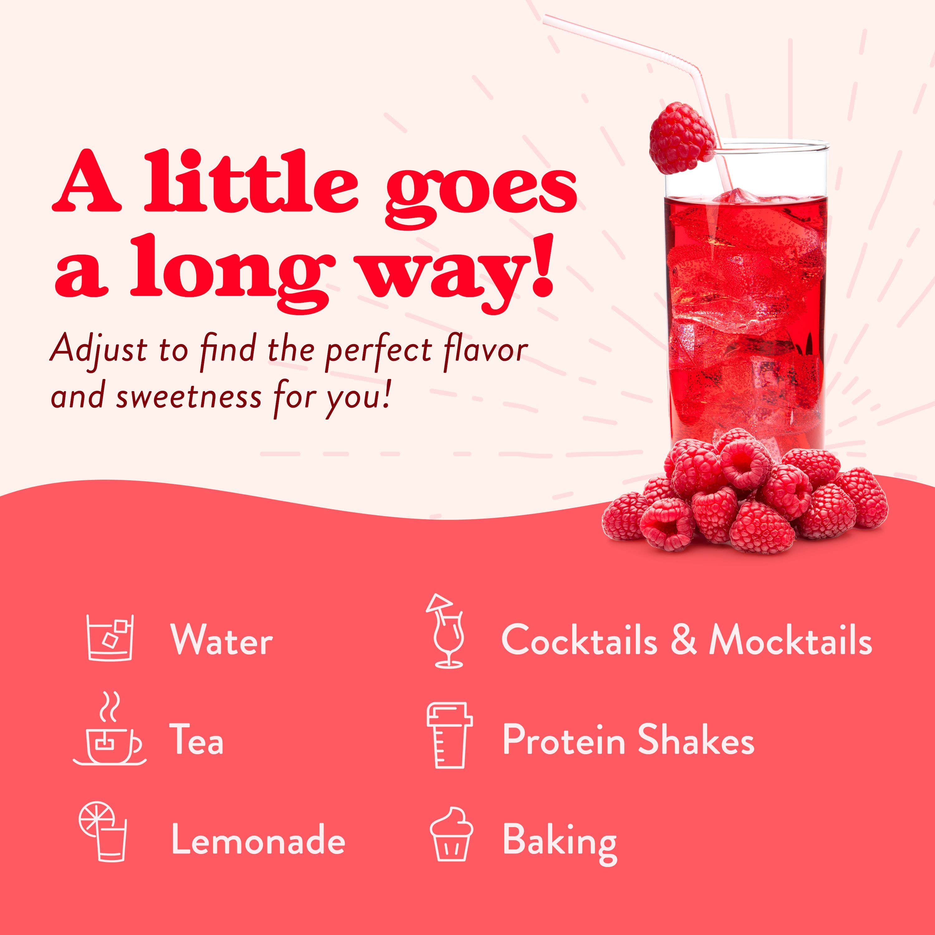Make refreshing lemonades, iced teas, smoothies, and add to alcoholic drinks for a sweet, fresh-picked raspberry-flavored drink. Add guilt-free flavor to teas, lemonades, water, smoothies, cocktails, juices, oatmeal, or just about anything. 🚫 0 Calories. 0 Sugar. 0 Carbs. πŸ’° 750 ml/25.4 fl. oz. Bottle - 25 Servings! βœ… Gluten-Free & Kosher. 🌱 Keto-Friendly. πŸ‡ΊπŸ‡Έ Made in the USA.