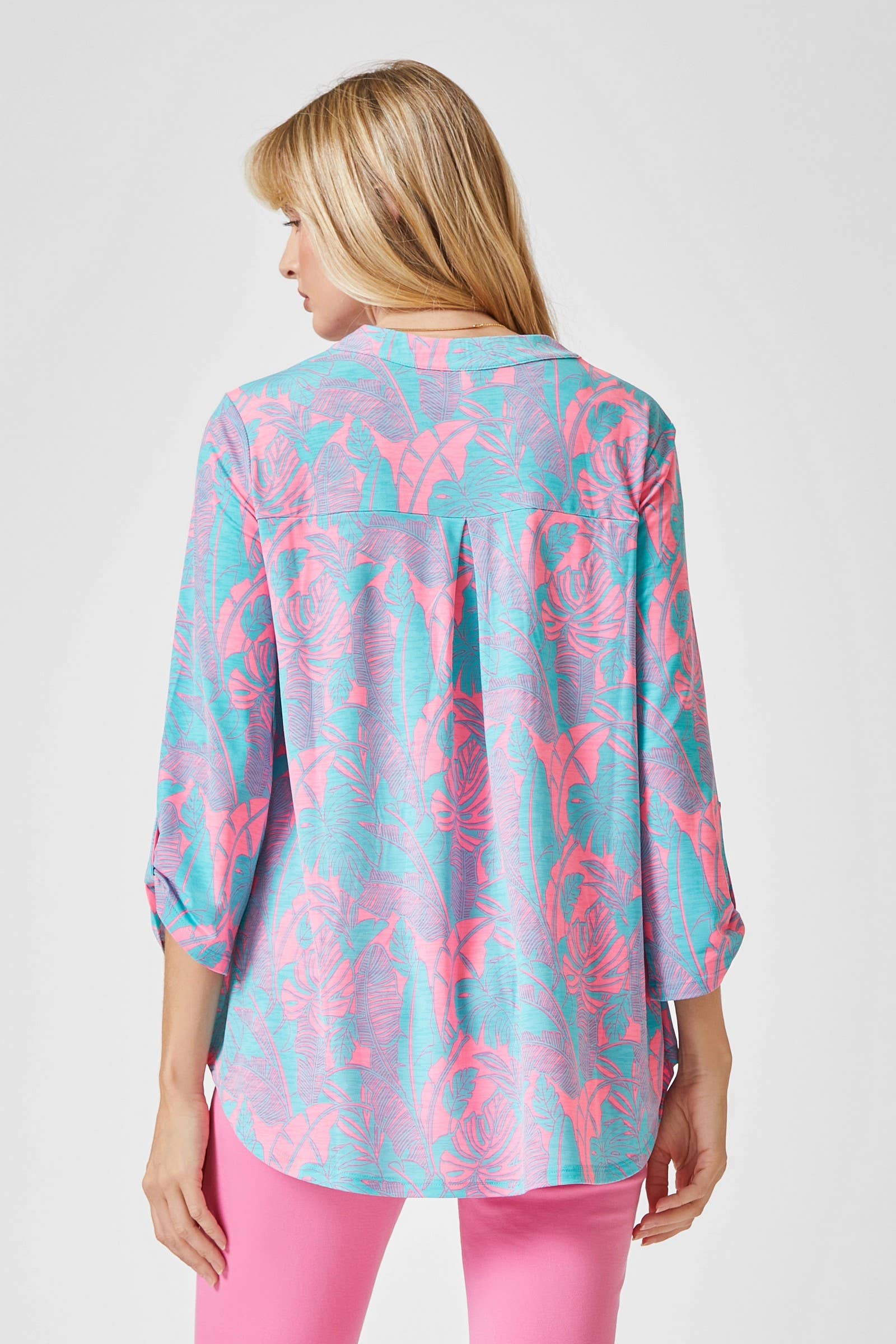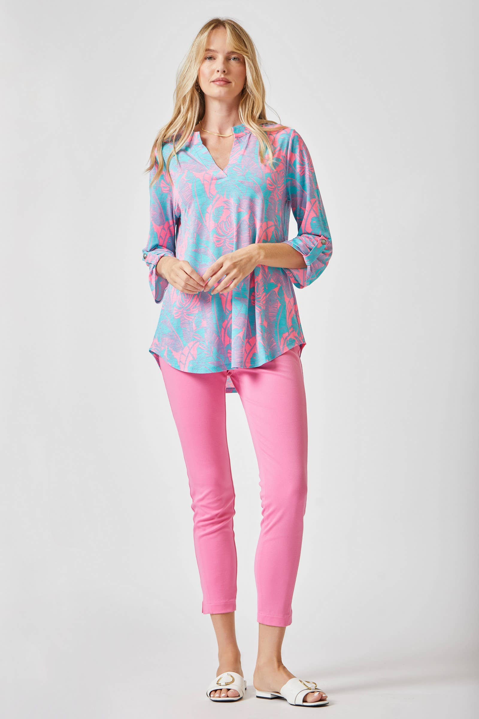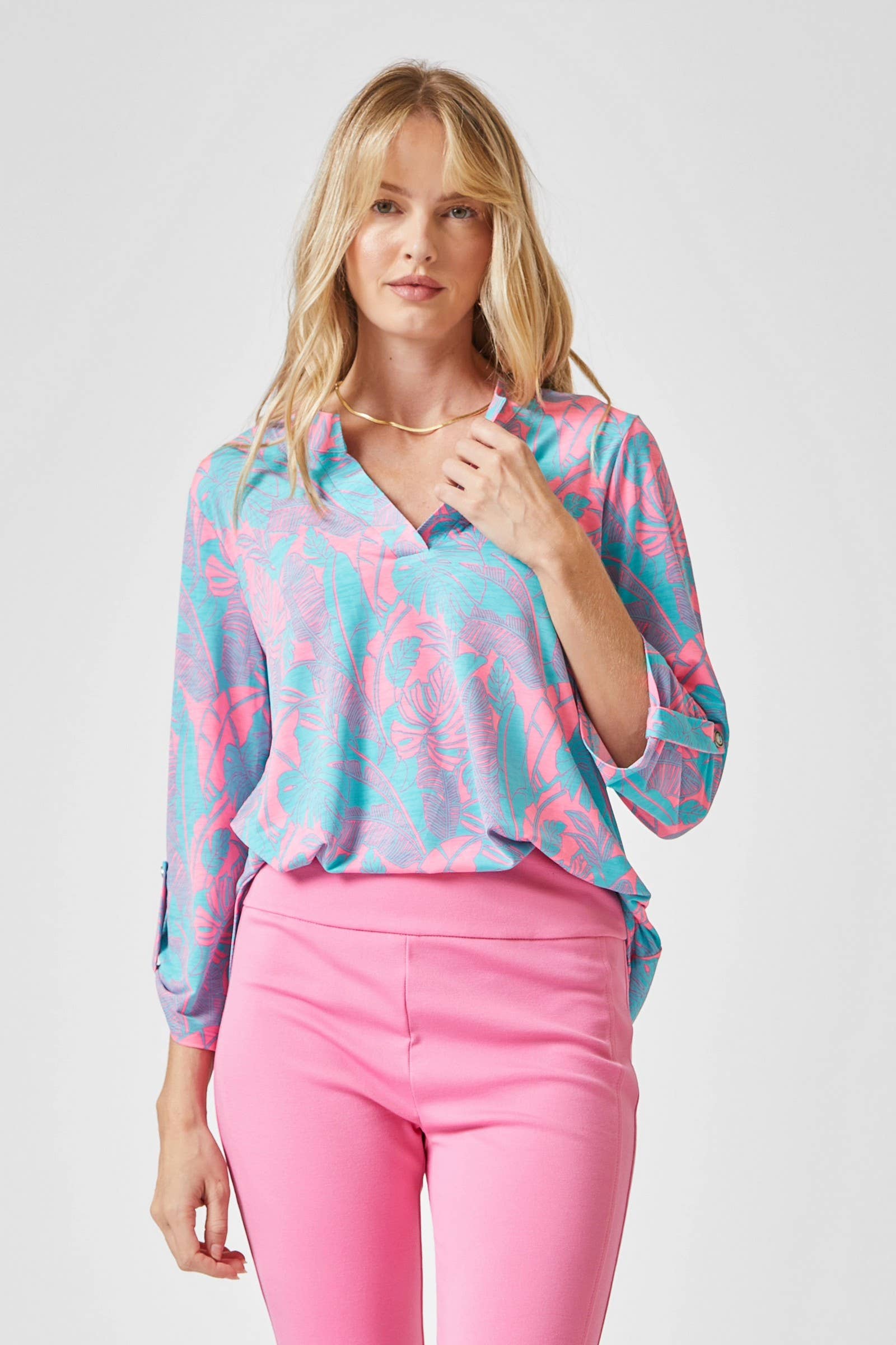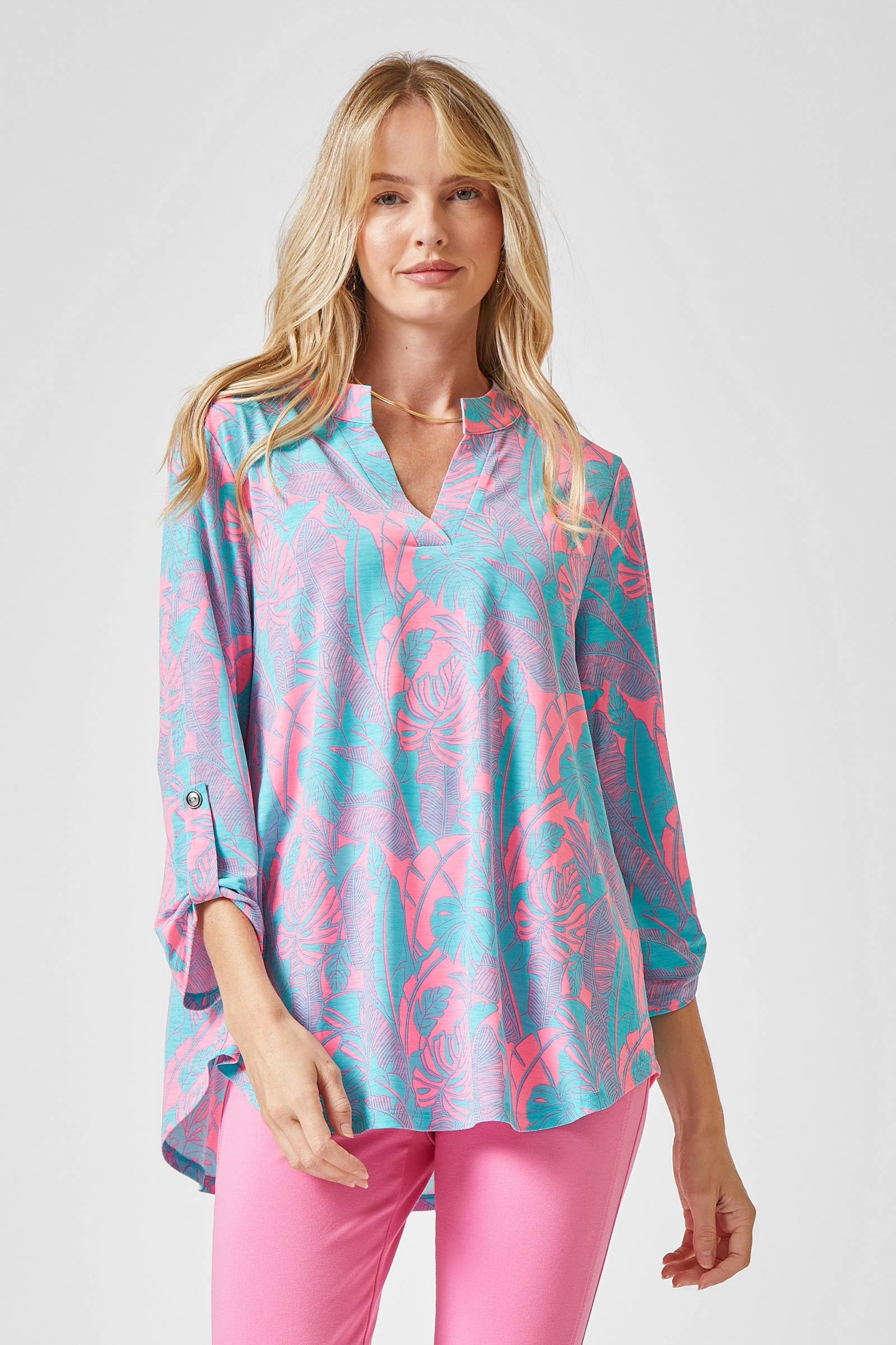 Our signature Lizzy top features poly blend which features luxurious softness with lightweight, wrinkle free comfort. This easy care fabric top is travel friendly, cooler than linen and other materials which makes your perfect ON THE GO wear. Lizzy top also features china collar neckline with 3/4" length sleeves with tab details. The fit is relaxed, flowy fit with slight high low.