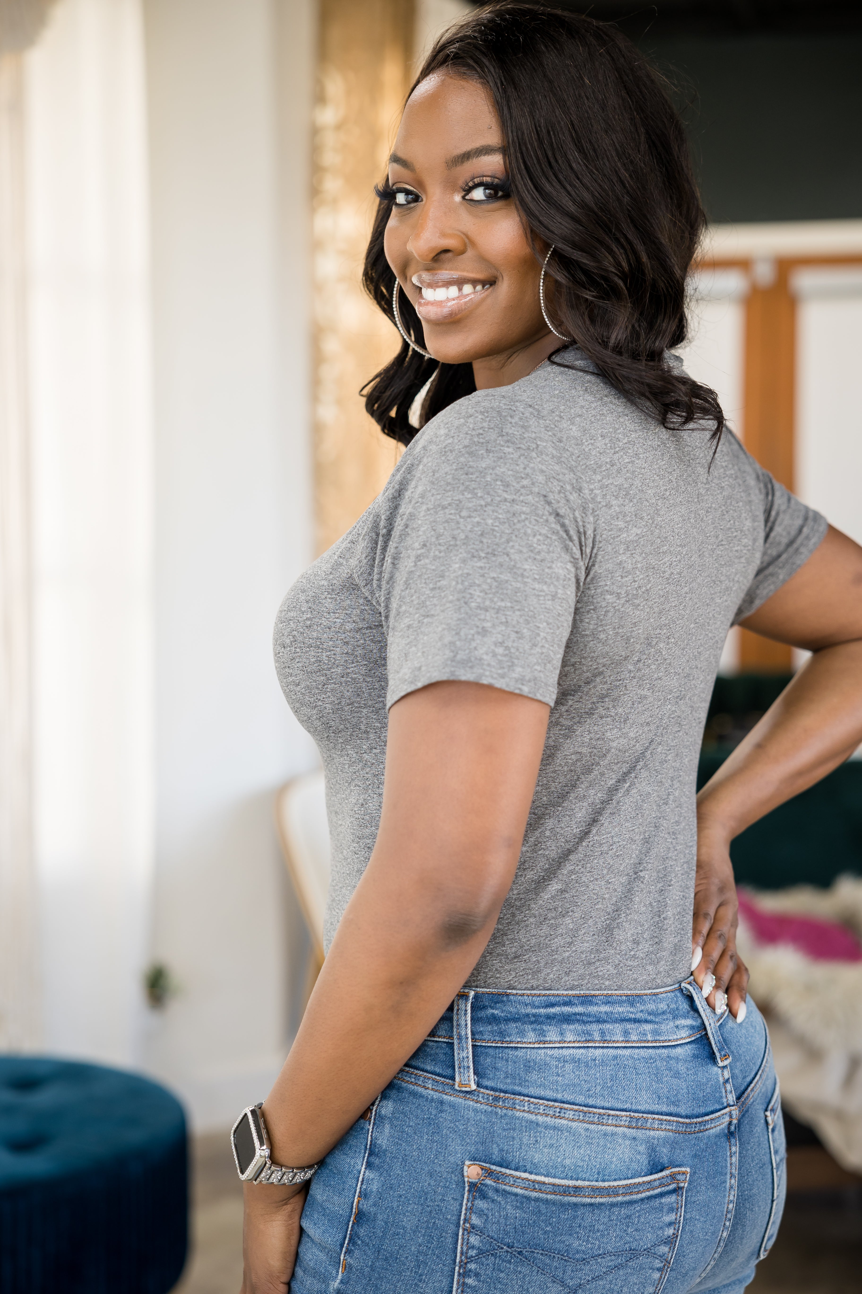 Whatever you decide to pair this buttery soft bodysuit with, you will be all put together! Bodysuits give you the perfect tuck, they are amazing to layer with, and they look great with just about any type of bottom (Jeans, Shorts, Skirts). With a fitted silhouette, this top features a v-neck, short sleeves and snap enclosure.