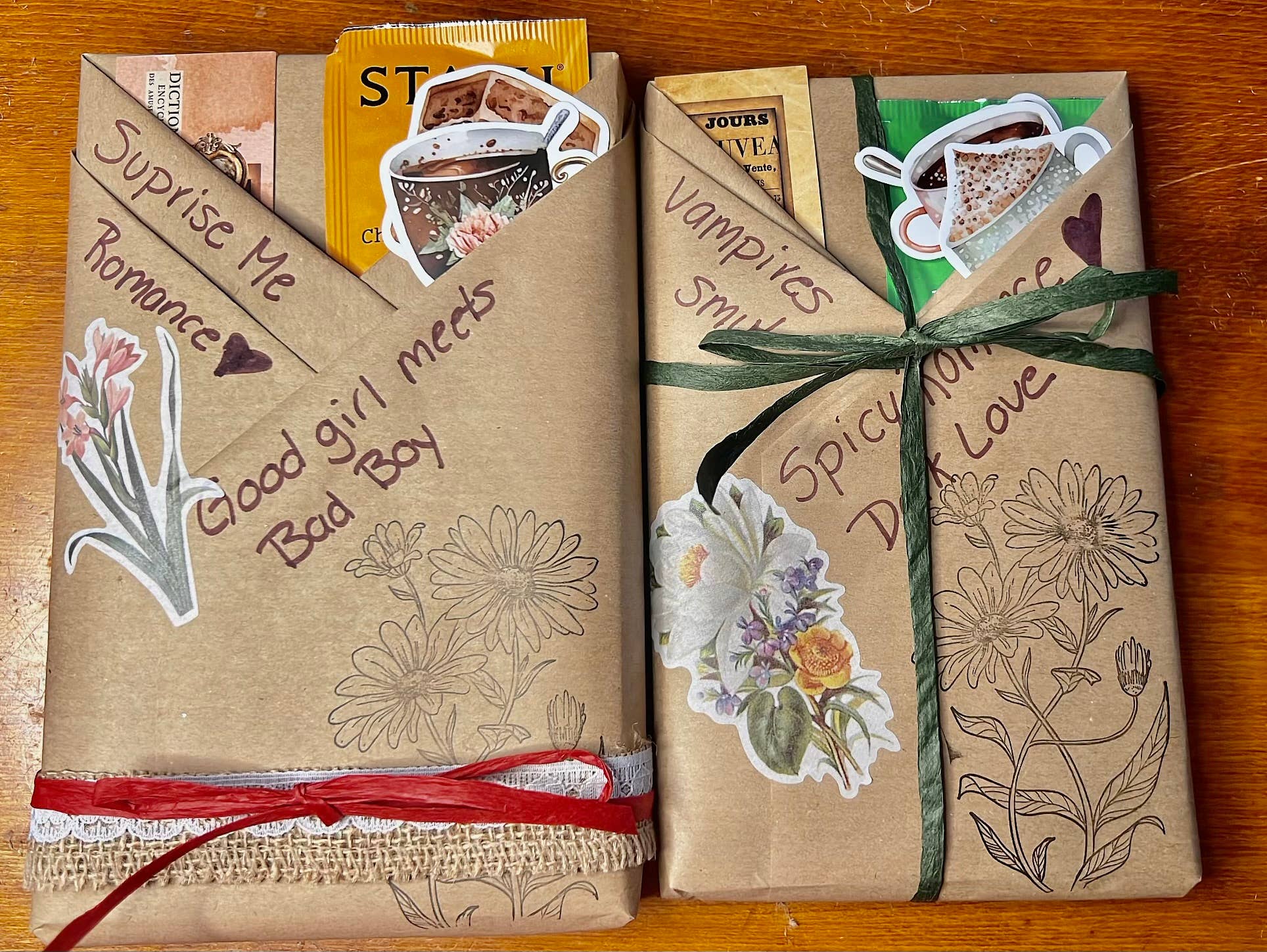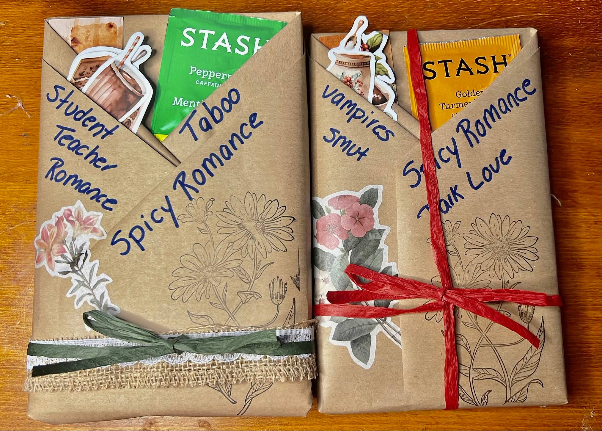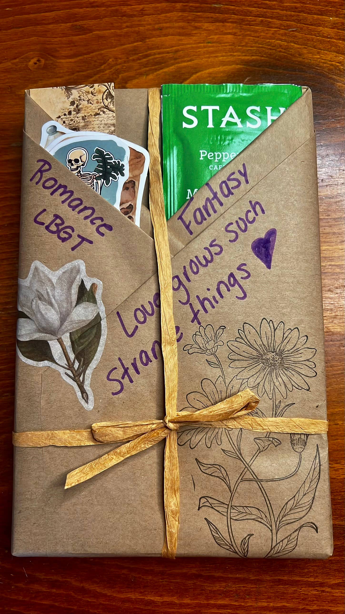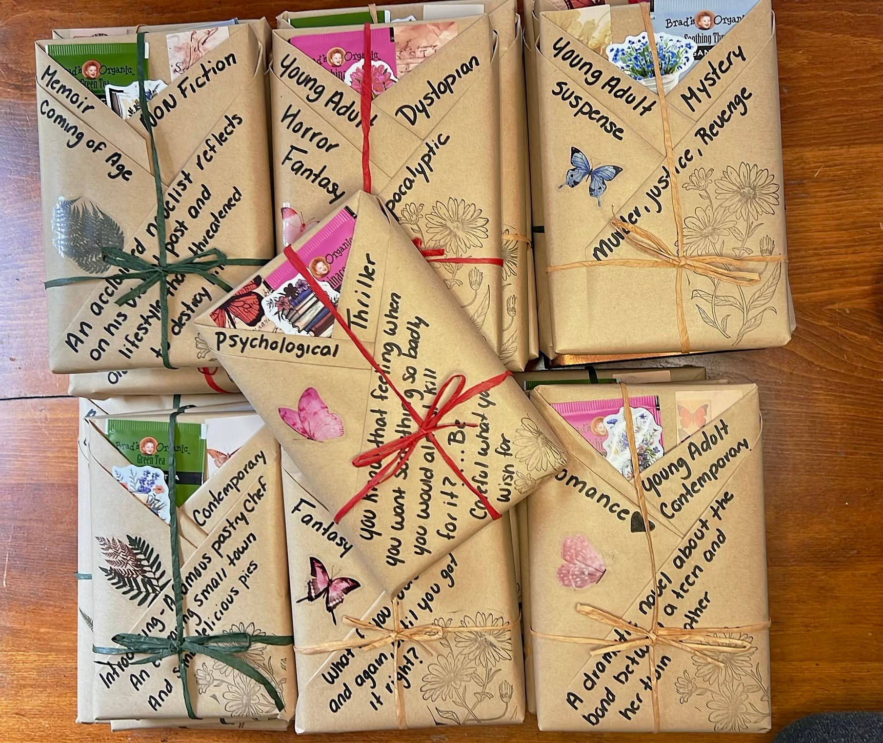 Each book will be wrapped and decorated. Each book will come with a bookmark, tea and sticker.