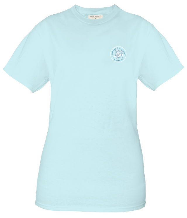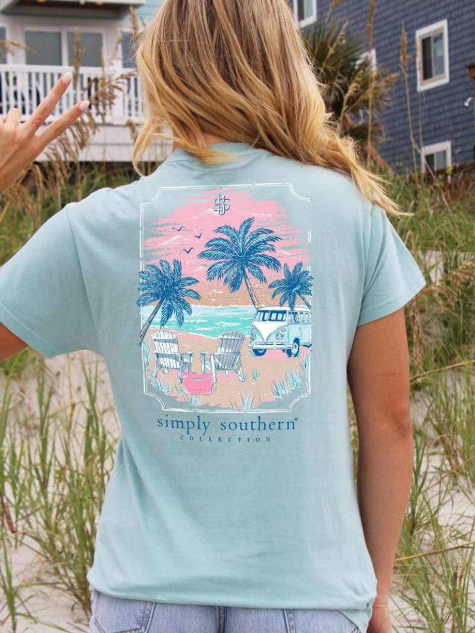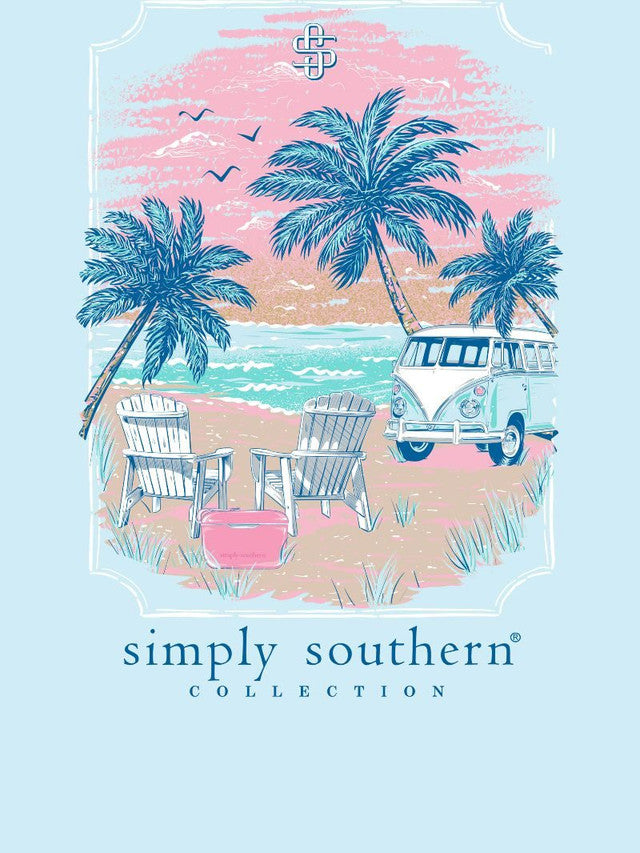 Ice blue short sleeve shirt with a beach scene at sunrise complete with beach chairs, a cooler, a bus, and palm trees. Simply Southern logo below and on left chest. Pre-shrunk and ring-spun 100% cotton. Unisex sizing.