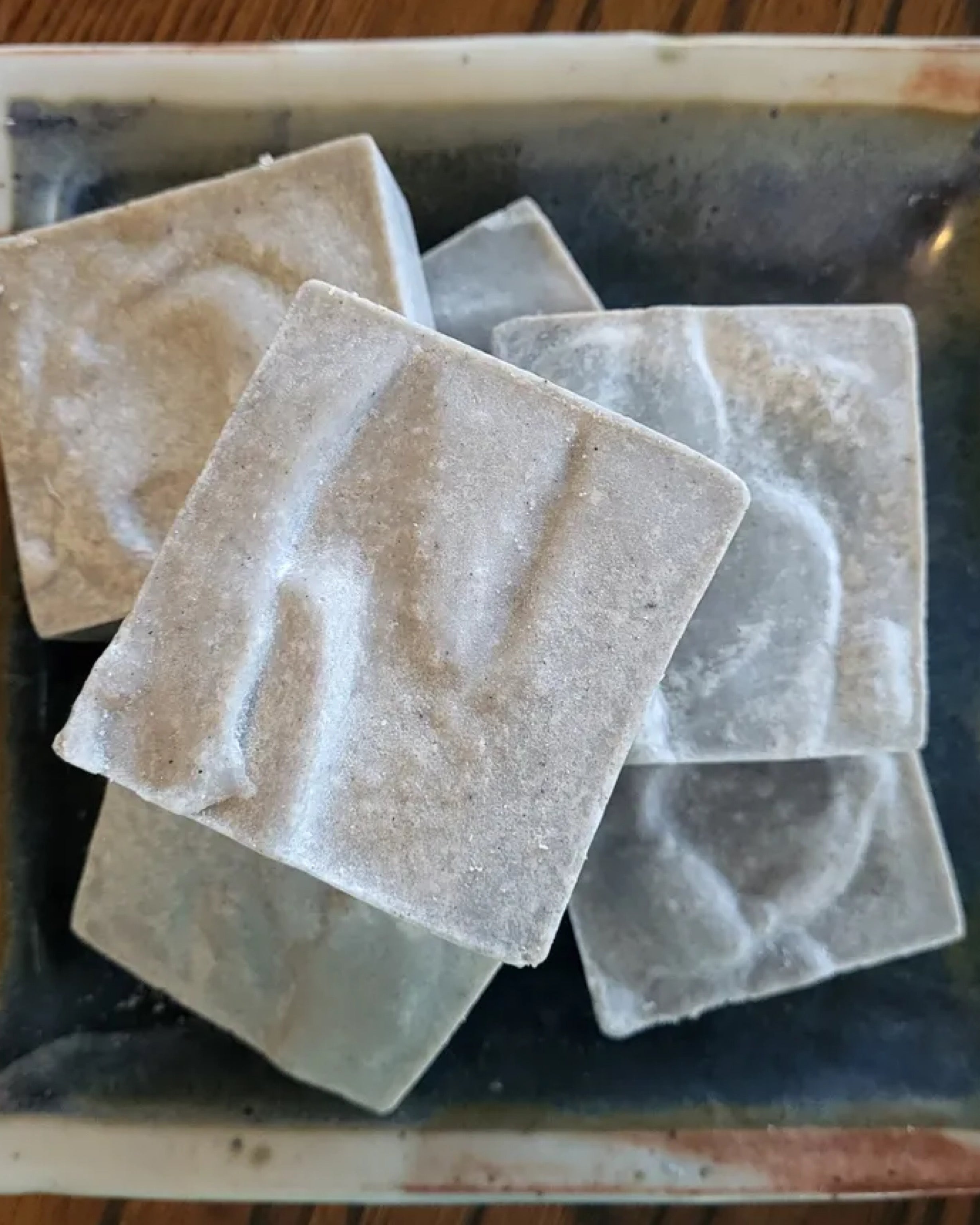 Ingredients: Saponified oils (sunflower, coconut), distilled water, cambrian blue clay, sea salt, fragrance oil