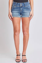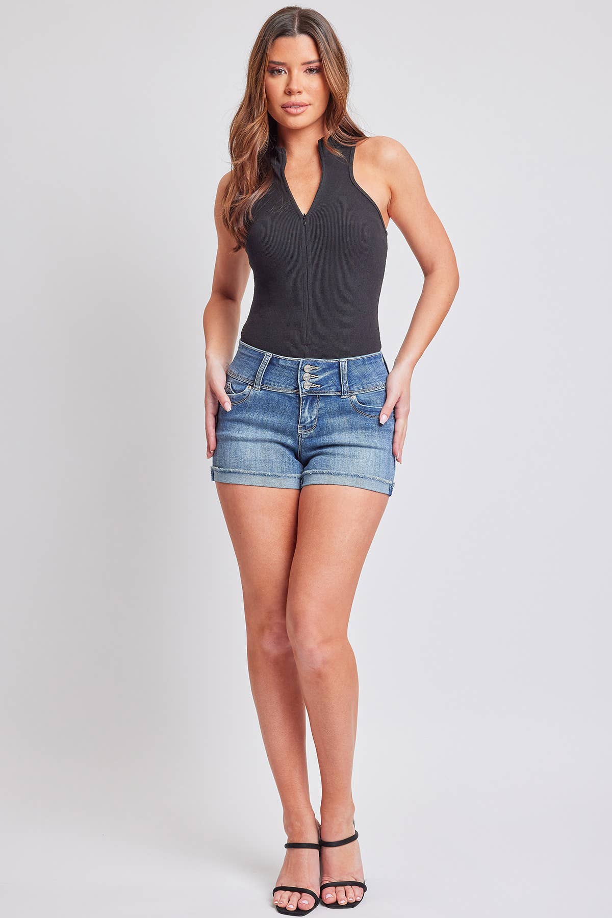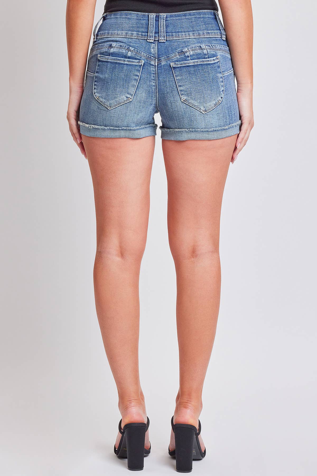 Junior WannaBettaButt 3 Button Cuffed Denim Shorts: Medium Wash
