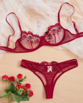 Ladies Sexy Deep Red Embroidery Sheer Bra Set w/ Matching Panty