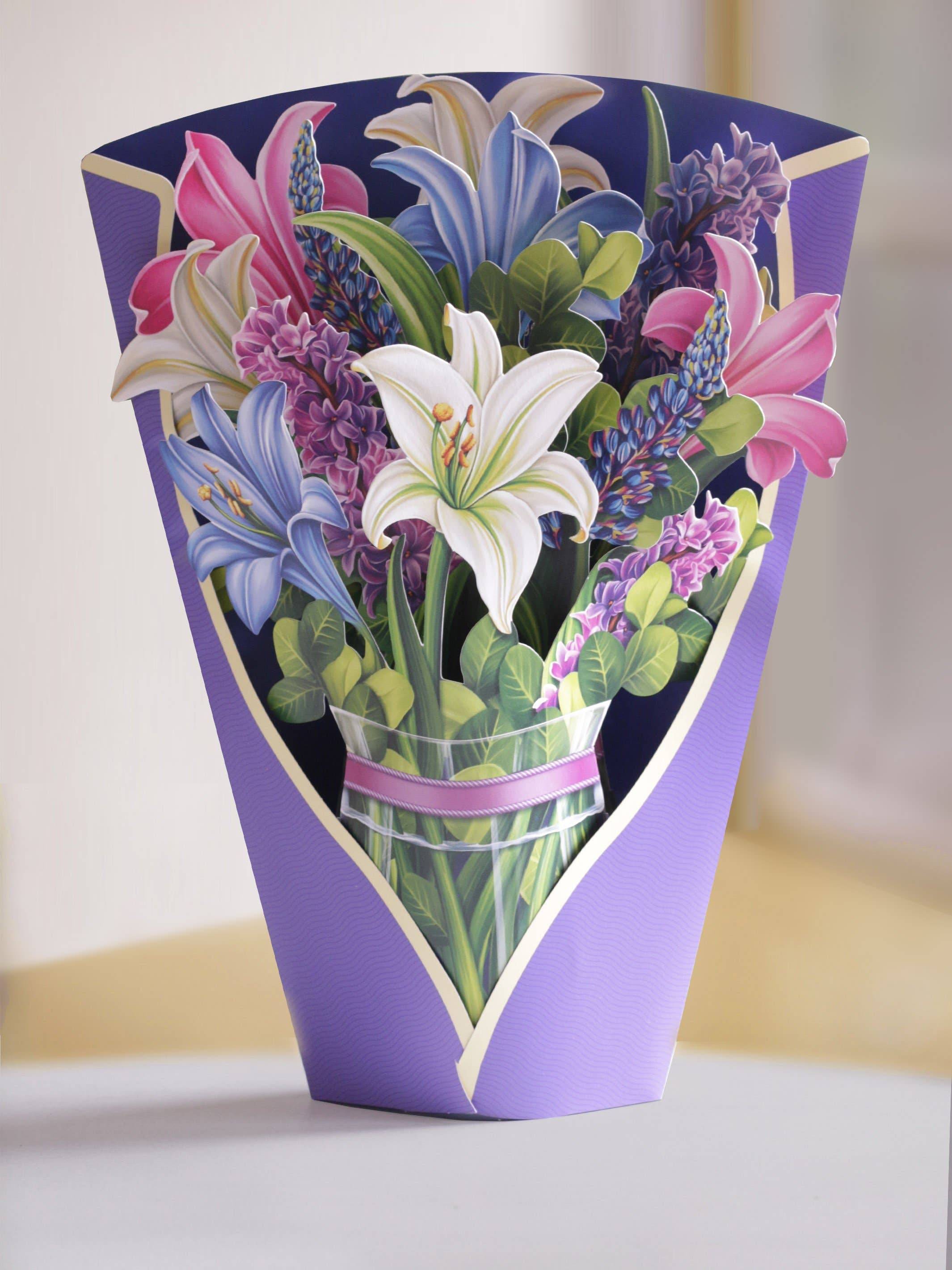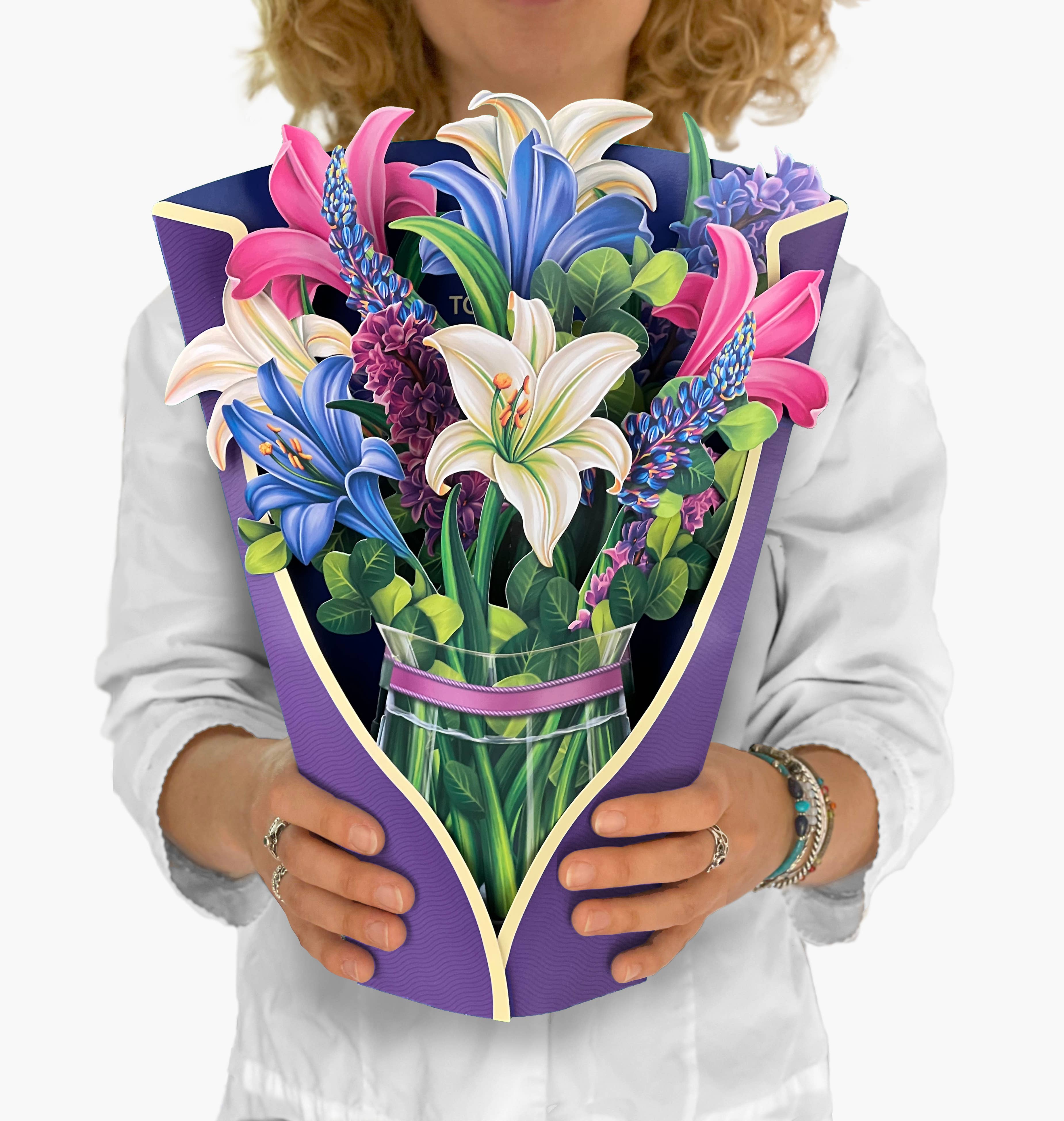 Lilies & Lupines (Flowers with envelope, notecard). Includes: pop up flower, matching note card and vibrant mailing envelope Samples available to purchase Perfect for Easter! Majestic Lilies, a symbol of rebirth, are combined with stately Lupines, celebrating the optimism that leads to the discovery of new opportunities. A thoughtful gift that bestows encouragement for the future - wishes as enduring as the bouquet.