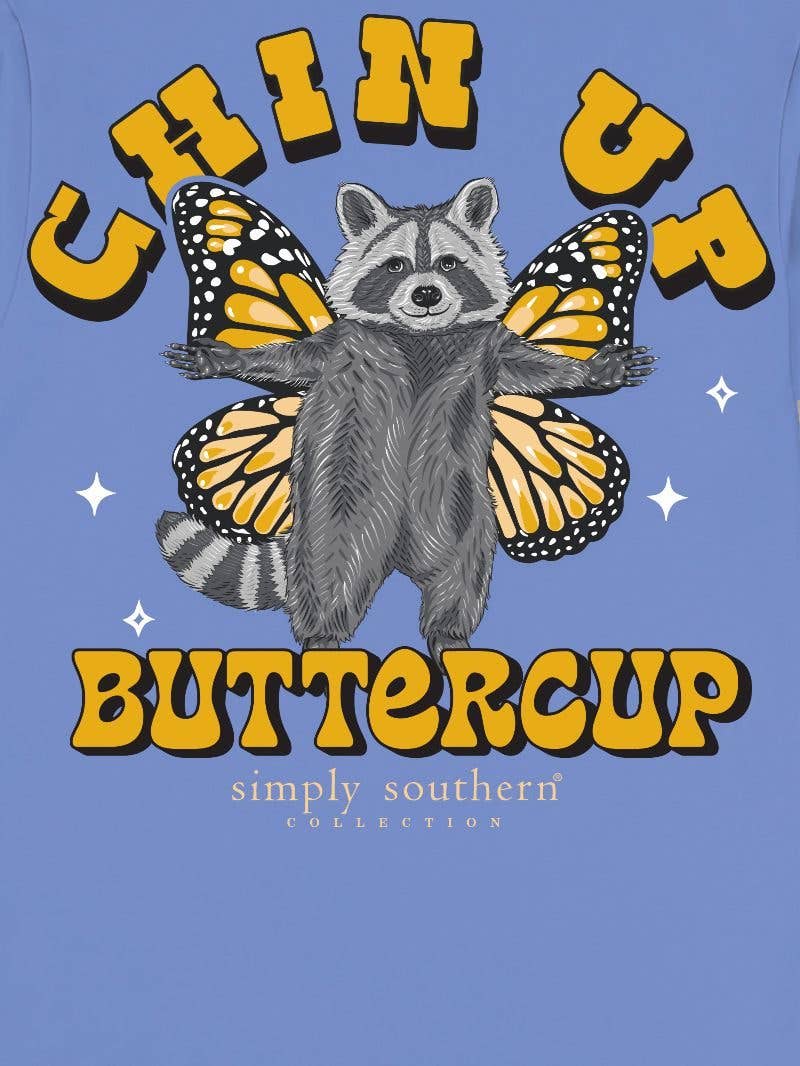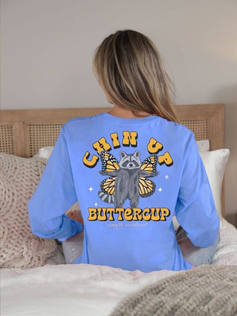 Vista blue long sleeve shirt with the phrase 'Chin up buttercup' and a racoon holding out his arms with butterfly wings behind. Simply Southern logo below, on left chest, and along right sleeve. 100% cotton. Unisex sizing