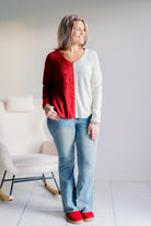 Embrace your wild side with our Merry Mint Split Top. Sporting a distinctive half red, half ivory look accented by a gentle cheetah print, this long sleeve tee is designed to turn heads. The v-neck and super-soft fabric make it so comfy, you’ll never want to take it off. Add a splash of fun to your wardrobe with this playful favorite!