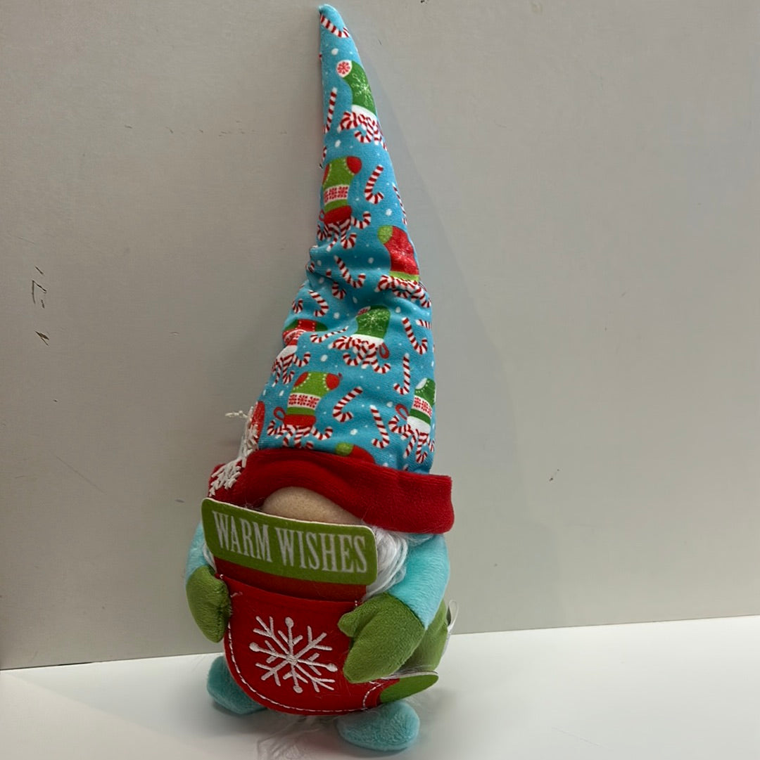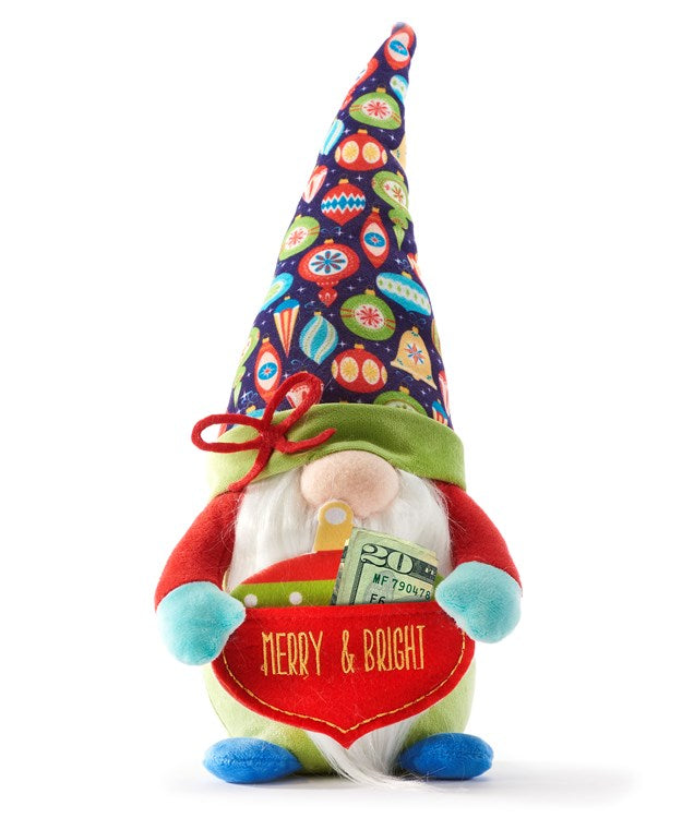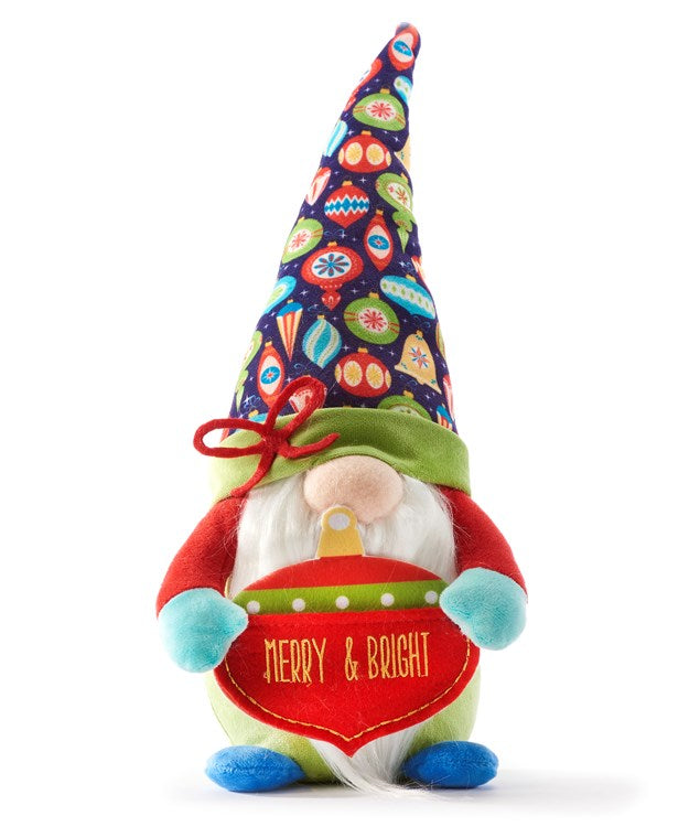 Soft plush gnome dressed with an ornament print hat, in festive holiday colors with a simple inspirational sentiment on a stitched red ornament pocket. Ideal for holding a gift card or a special note. MERRY & BRIGHT. Polyester.