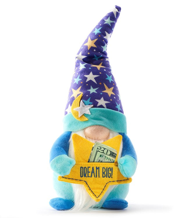 Soft plush gnome styled with a star print hat, dressed in bright colors and features a simple inspirational sentiment on a stitched yellow star pocket. Ideal for holding a gift card or a special note. DREAM BIG! Polyester.