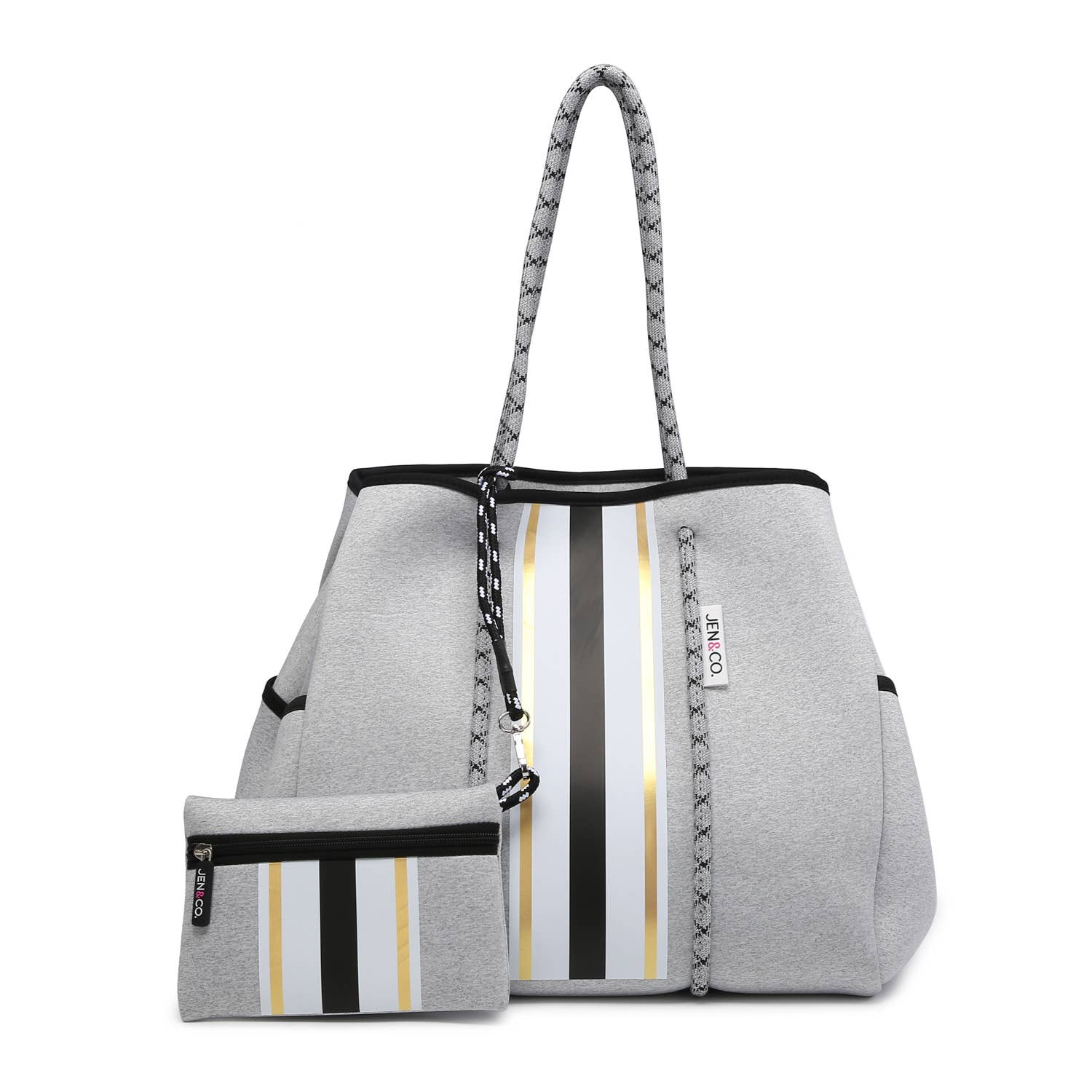 Extra large neoprene tote with side pockets Inside slot and compartments Inside removable pouch Washable Dimensions: 16"L x 13"H x 10"D